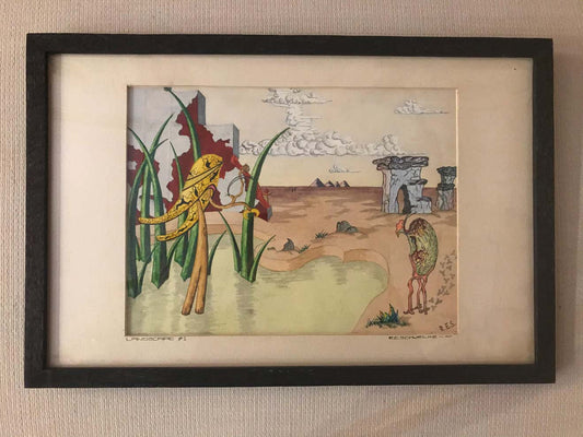 Surrealist Landscape Watercolor Signed R. E. Schwelke and Dated 1947