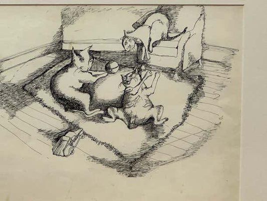 "Playful Pets" Satirical Ink Drawing of Three Cats