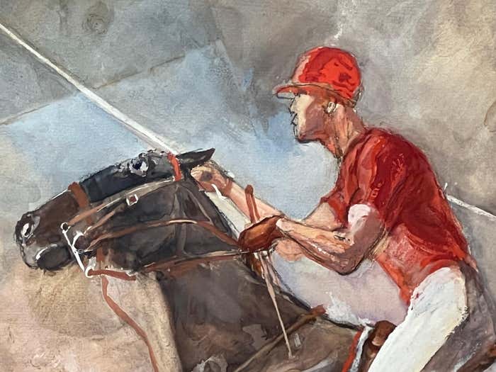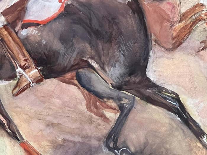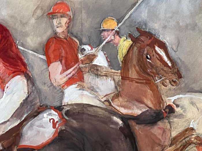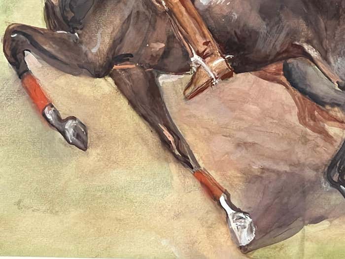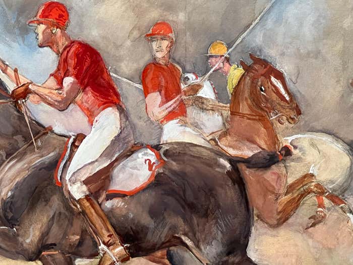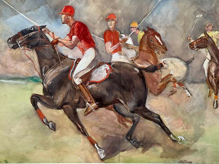 It depicts a thrilling equestrian polo match from the 1930s, featuring four riders in traditional polo uniforms. One team is dressed in red attire, while the other wears yellow. Each rider confidently holds a long stick, already engaged in a fast-paced game. The horses exude energy as they gallop across the scene, with two of them showing intense excitement by pressing their ears tightly against the back of their necks. It's important to note that the 1930s marked the golden era of polo in America. The vibrant and lively essence emanating from this watercolour showcases Dunn's talent to express movement and details. We can see his knowledge of horses' anatomy and his passion for capturing the fastness and the spirit of the sport.