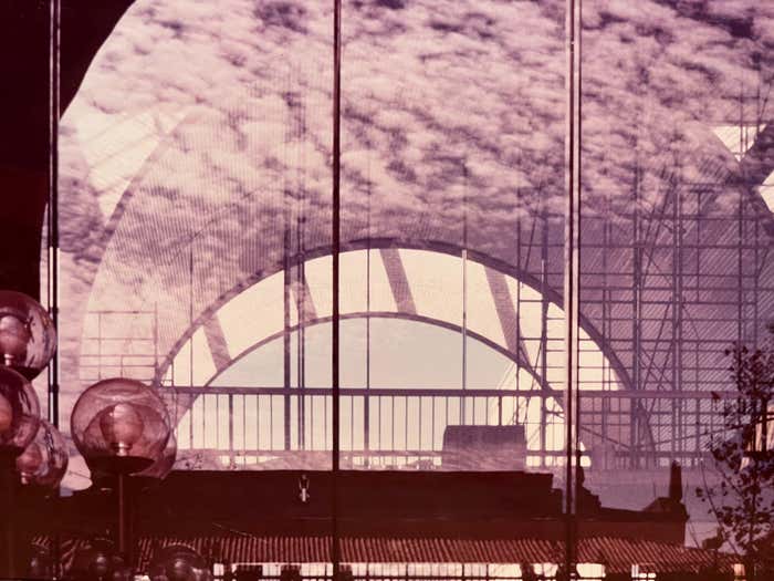 This photograph by Shirley Bleviss reveals a striking interplay of rounded forms and linear structures, all rendered in a restrained monochromatic palette. At its center, a luminous archway dominates the composition, serving as both portal and anchor, while layers of scaffolding, railings, and reflective glass create a dense architectural web.