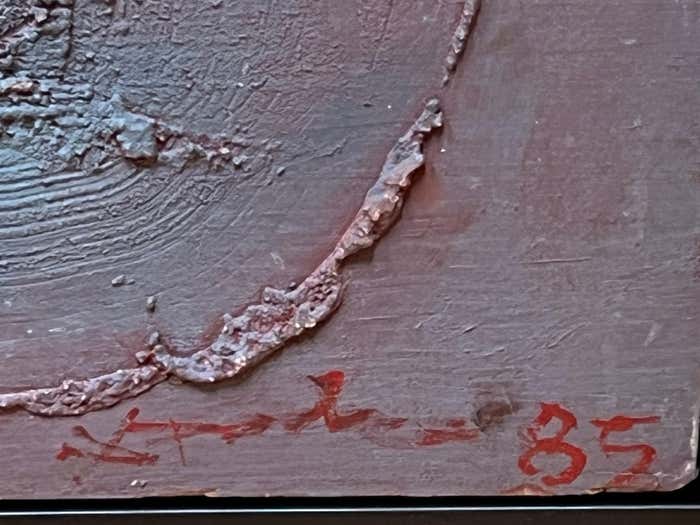 This square-framed abstract artwork, textured with blue-grey and purple hues, features an illegible signature and is dated 1985 in the right corner.