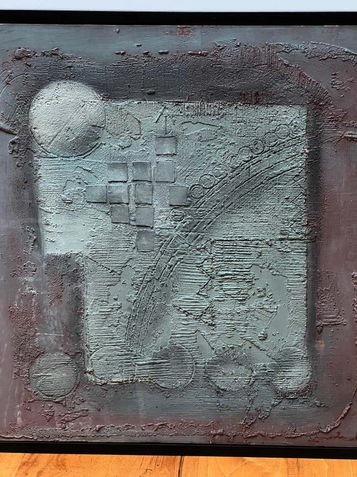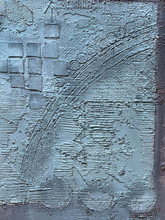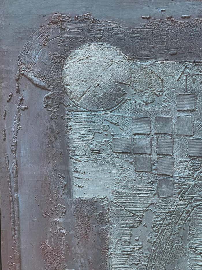 The artist created texture and uneven patterns using plaster and collages to give life to his work.