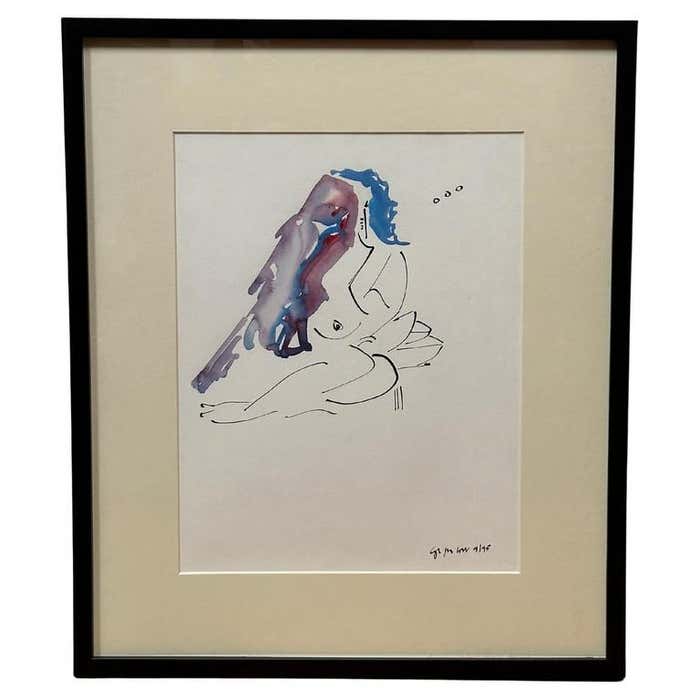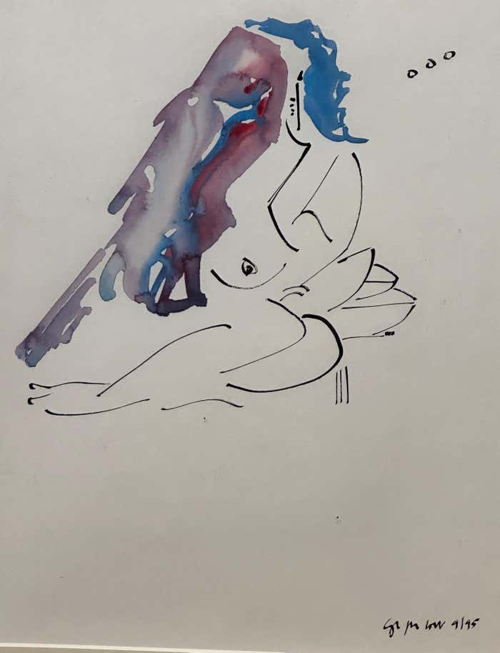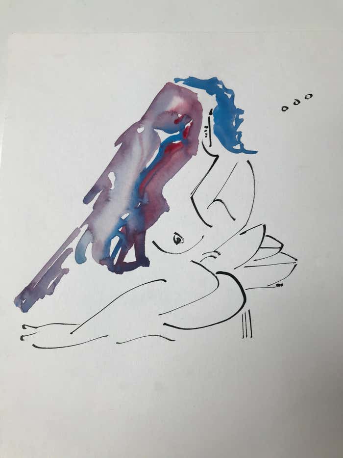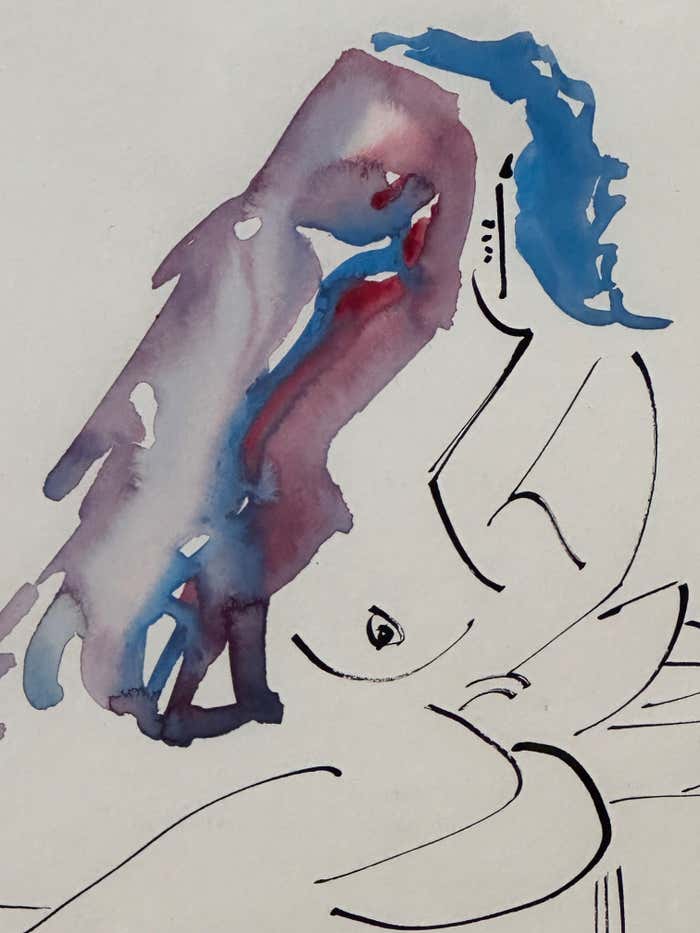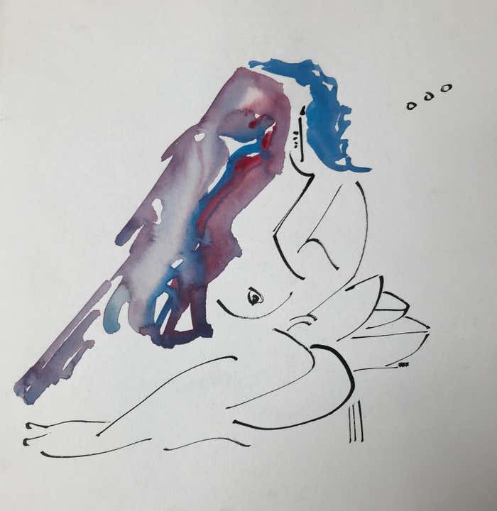 "Blue Hair Woman and a Bird" Minimalist Watercolor #3 by Christopher Paul Cobb