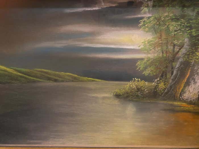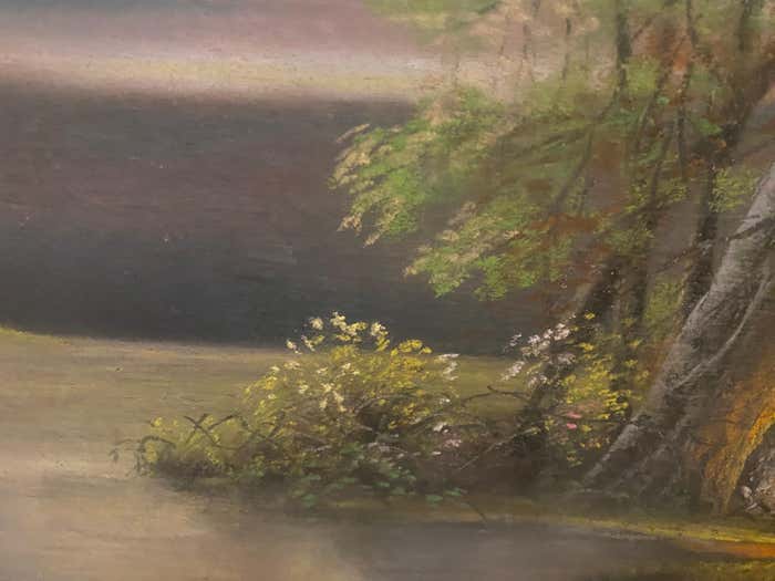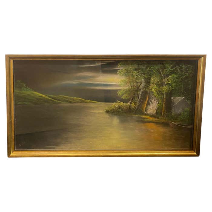 "Cabin by the Lake at Dusk" Midcentury Modern Landscape Oil Painting