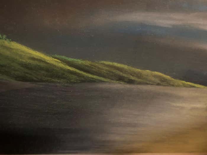The light, an essential element of the work, doesn't dazzle: it grazes. It doesn't pierce the sky, but caresses it, playing with shades of ochre, grey and blue. The horizon fades into a misty softness, as if the world were dissolving between dawn and dusk.