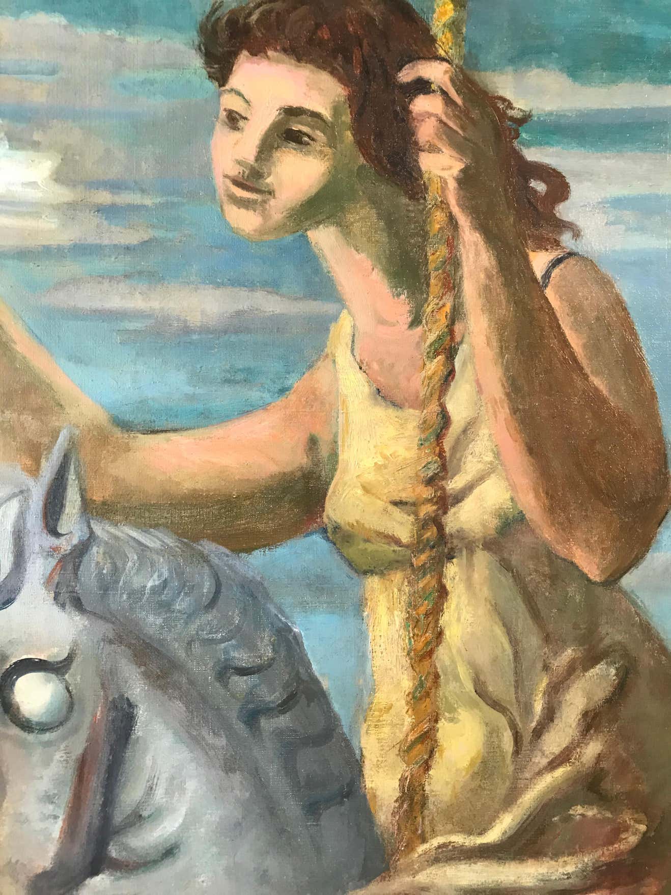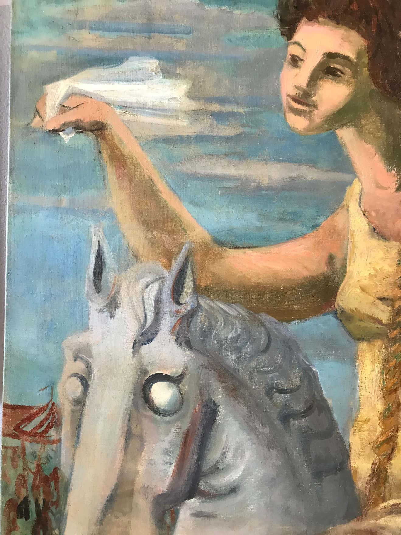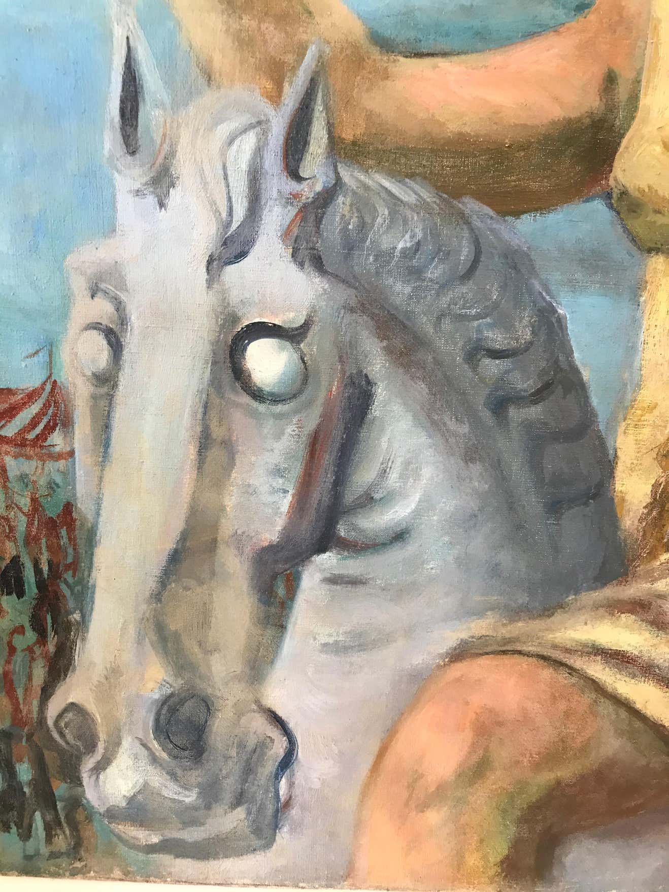 A painting of a woman riding on a carousel horse while holding out her white handkerchief to flow in the wind.