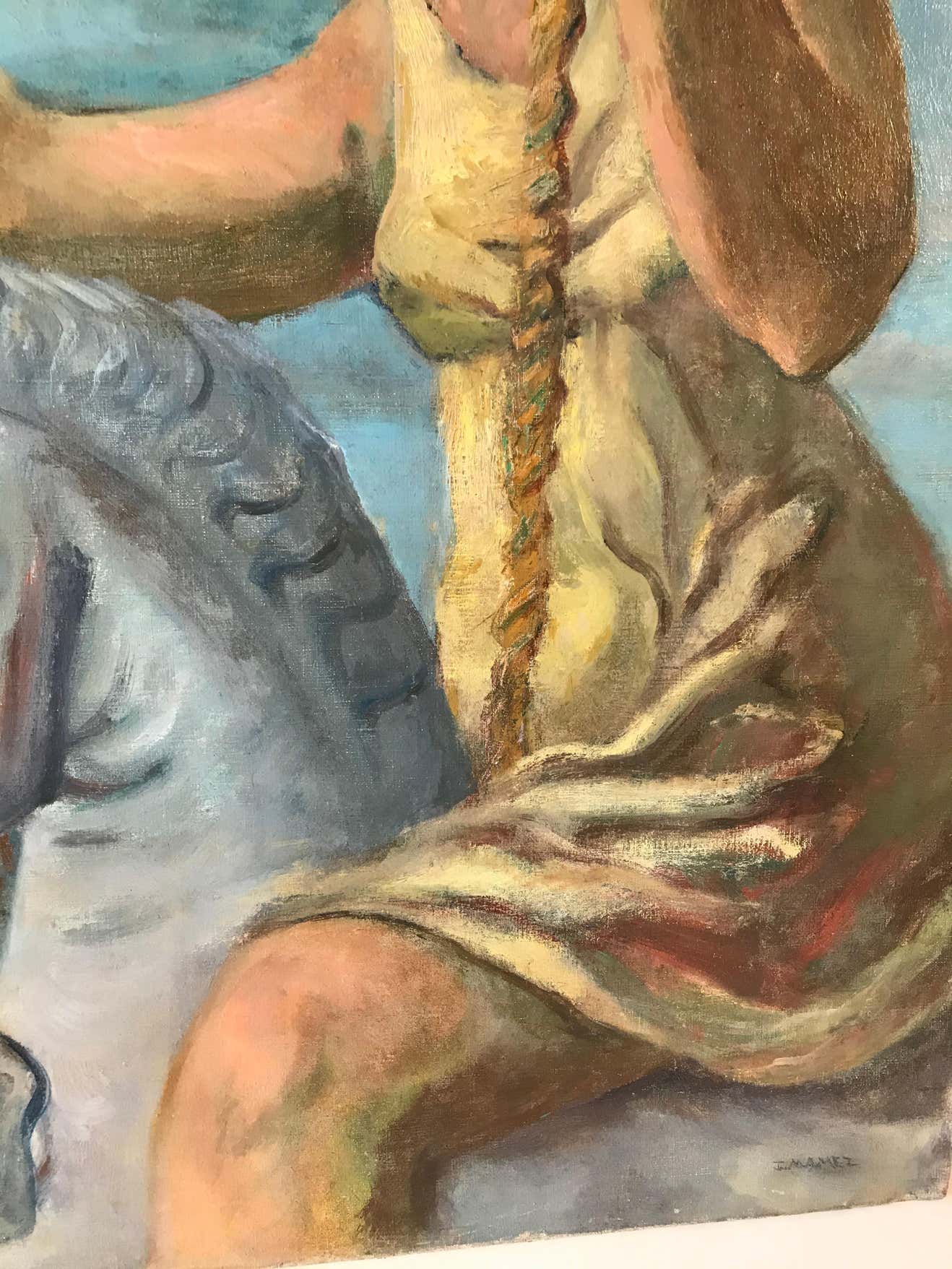 The painting uses realistic and soft colors, adding to the dream-like narrative.
