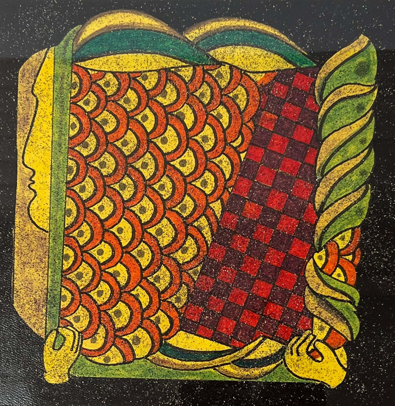 Mosaic-like, this piece is semi-abstract and compact yet very simple. The colors used are playful.