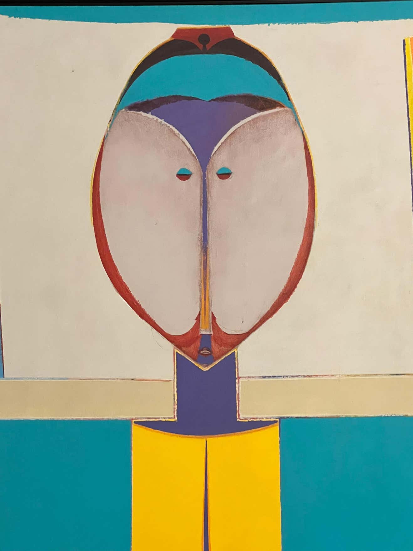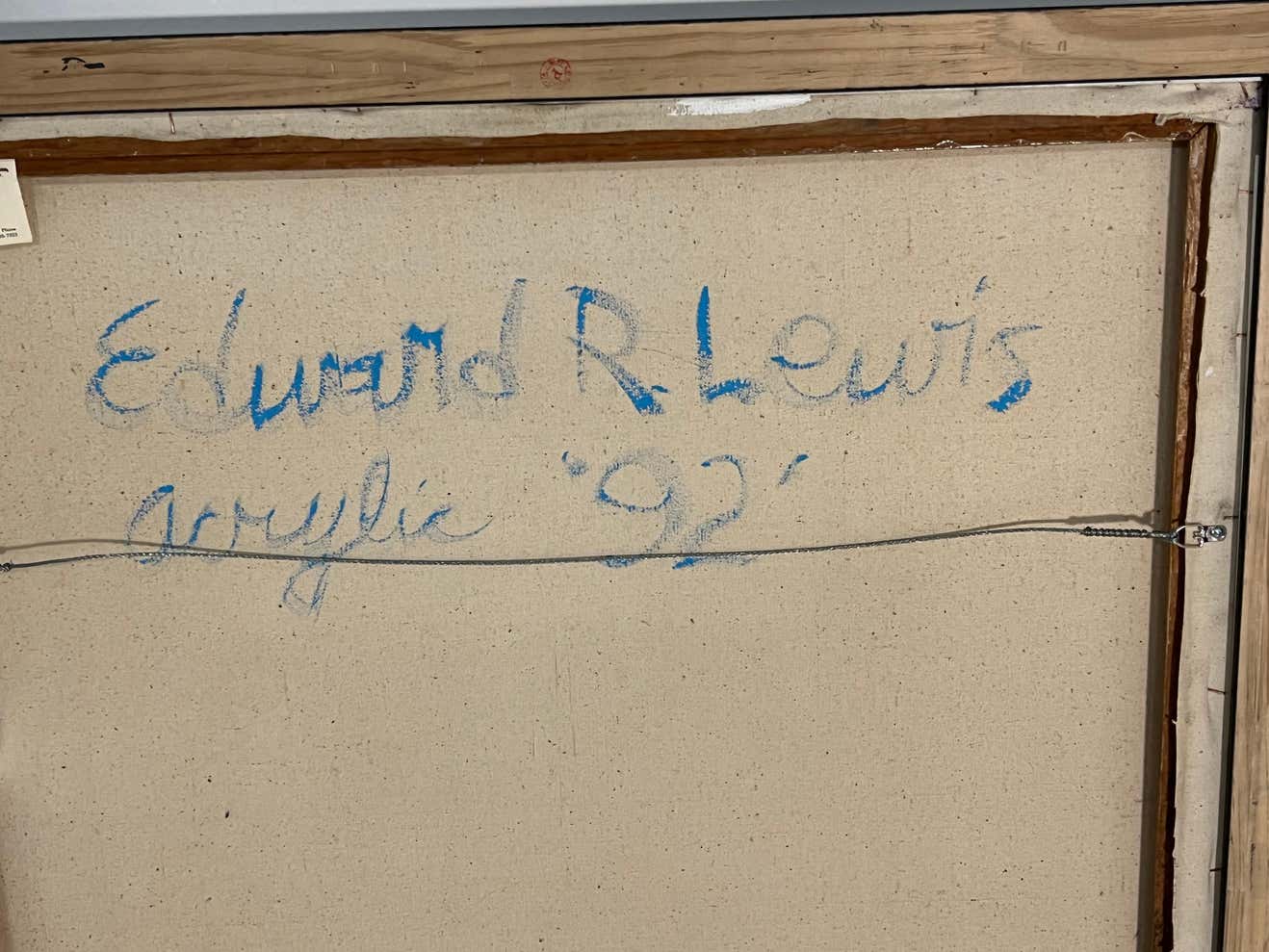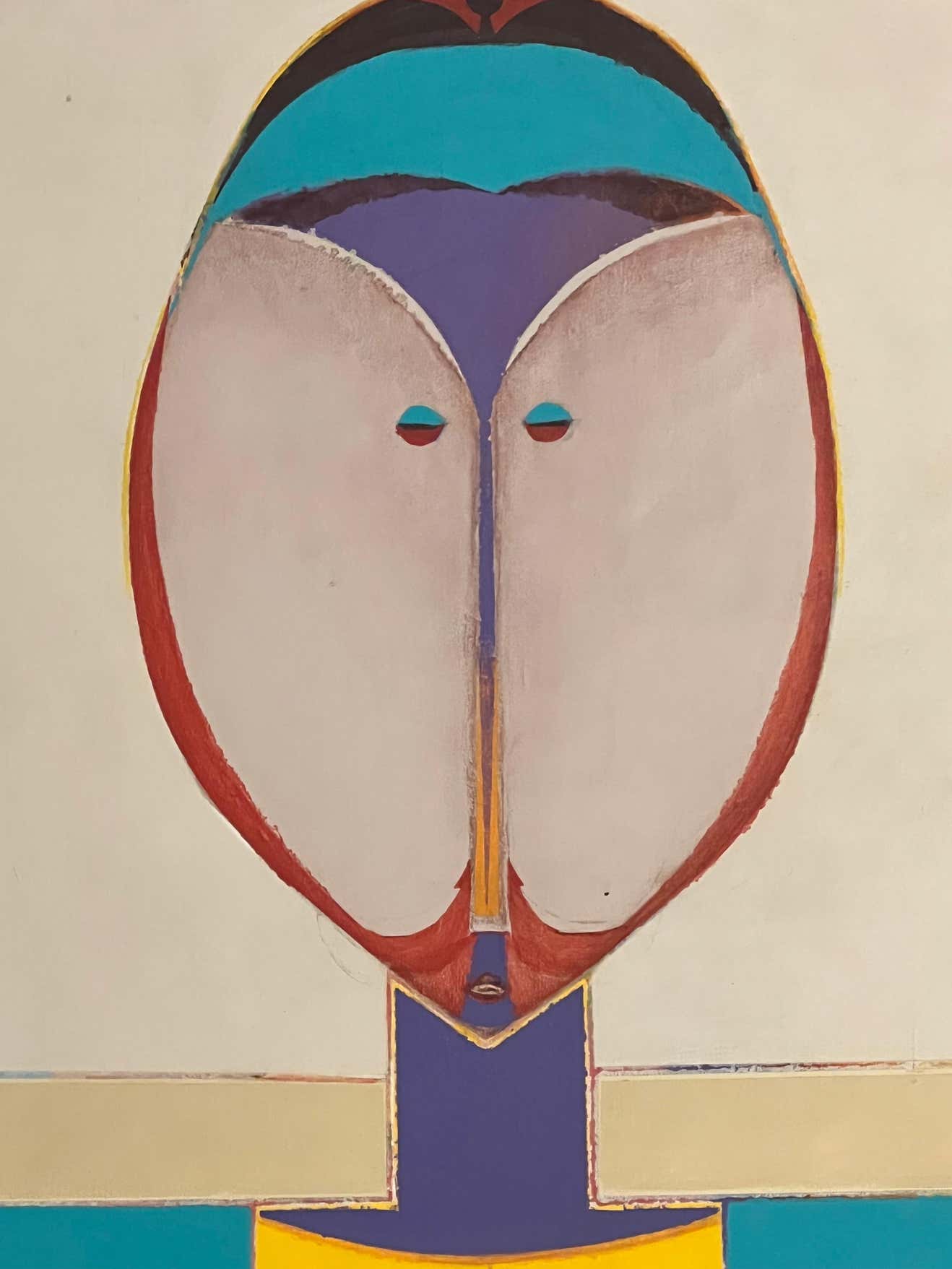 Born in Rollis, Minnesota, the Colorist Edward R. Lewis enjoyed a long career as a painter, prolific in watercolour, oil, and acrylic. He also dedicated his life to teaching the arts and spent the majority of his artistic career as an art professor holding positions at Sioux Falls College, Sioux Falls, South Dakota; and at Central Missouri State University (now the University of Central Missouri) in Warrensburg, Missouri. His vibrant canvases often ask the viewer to make a quantum leap in perception, as his colours are the vehicle by which he describes light and space. In this captivating acrylic on canvas, the artist Edward R. Lewis (1914-1992) masterfully blends the symbolism of African masks, and primitive arts with simple geometrical shapes, colours, and lines to explore themes of identity, transformation, emotions, and spirituality.