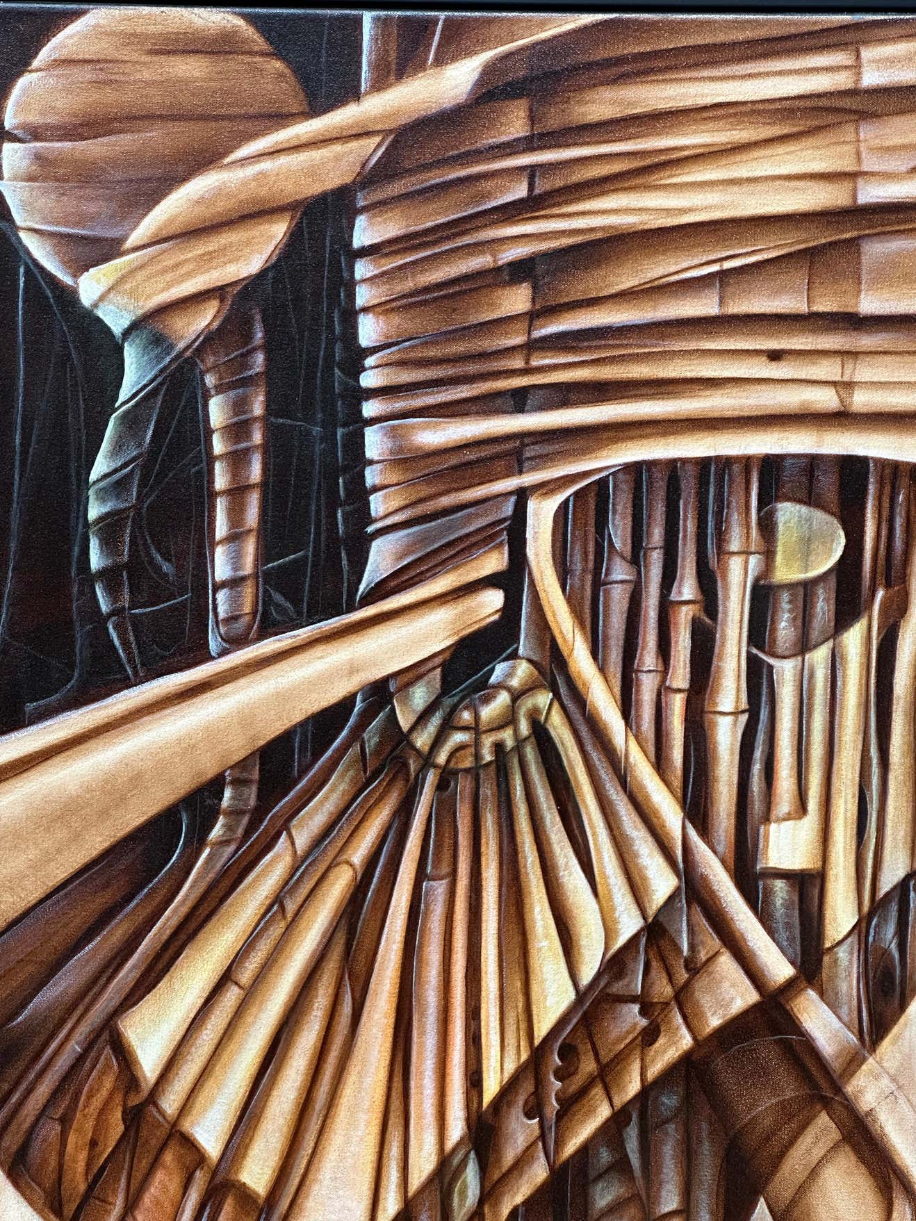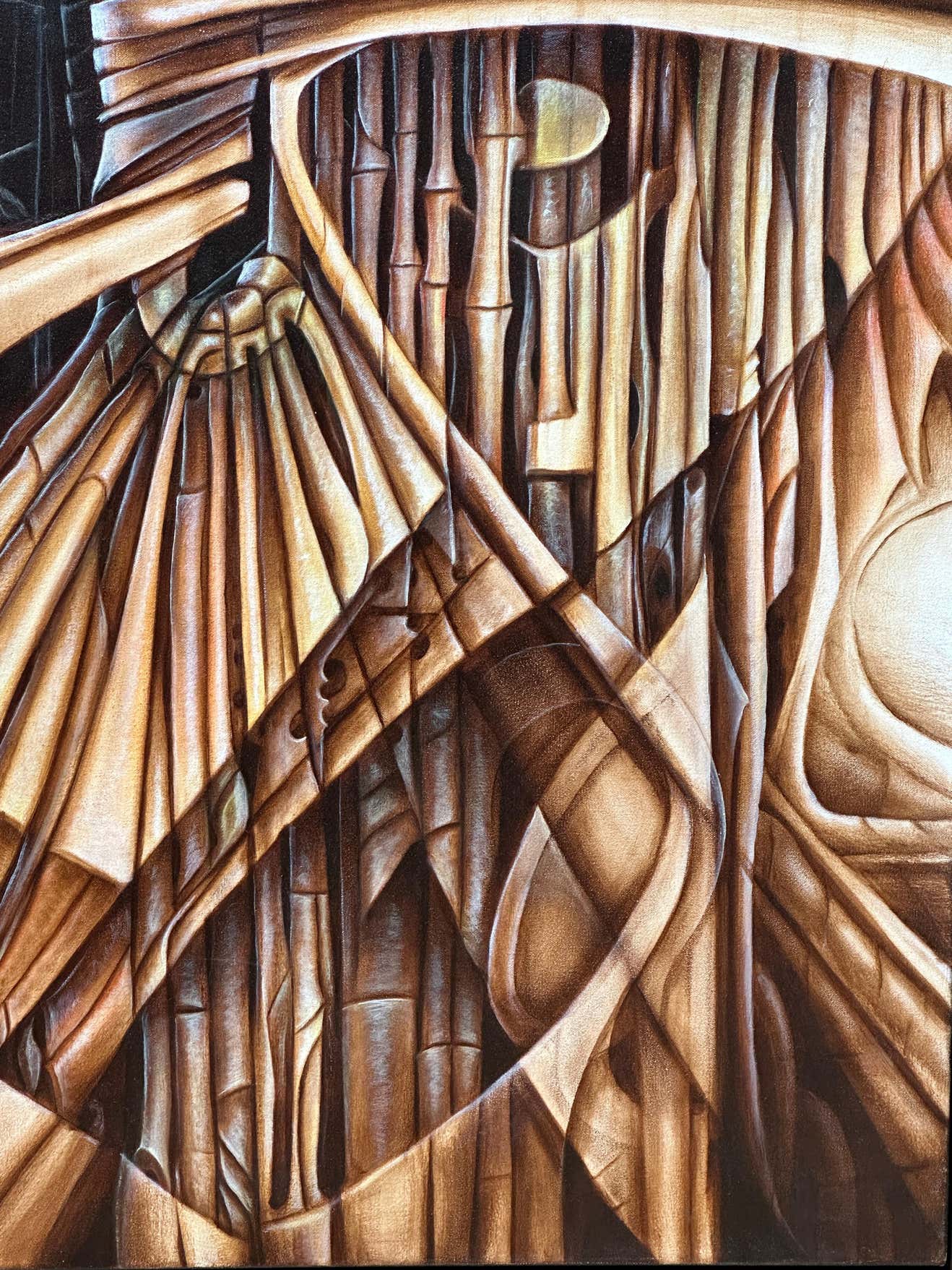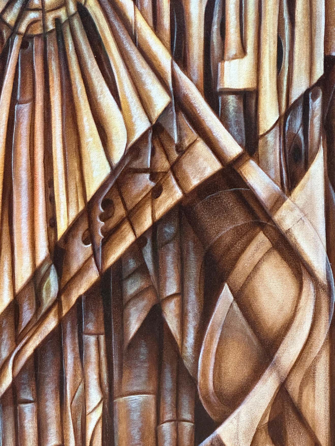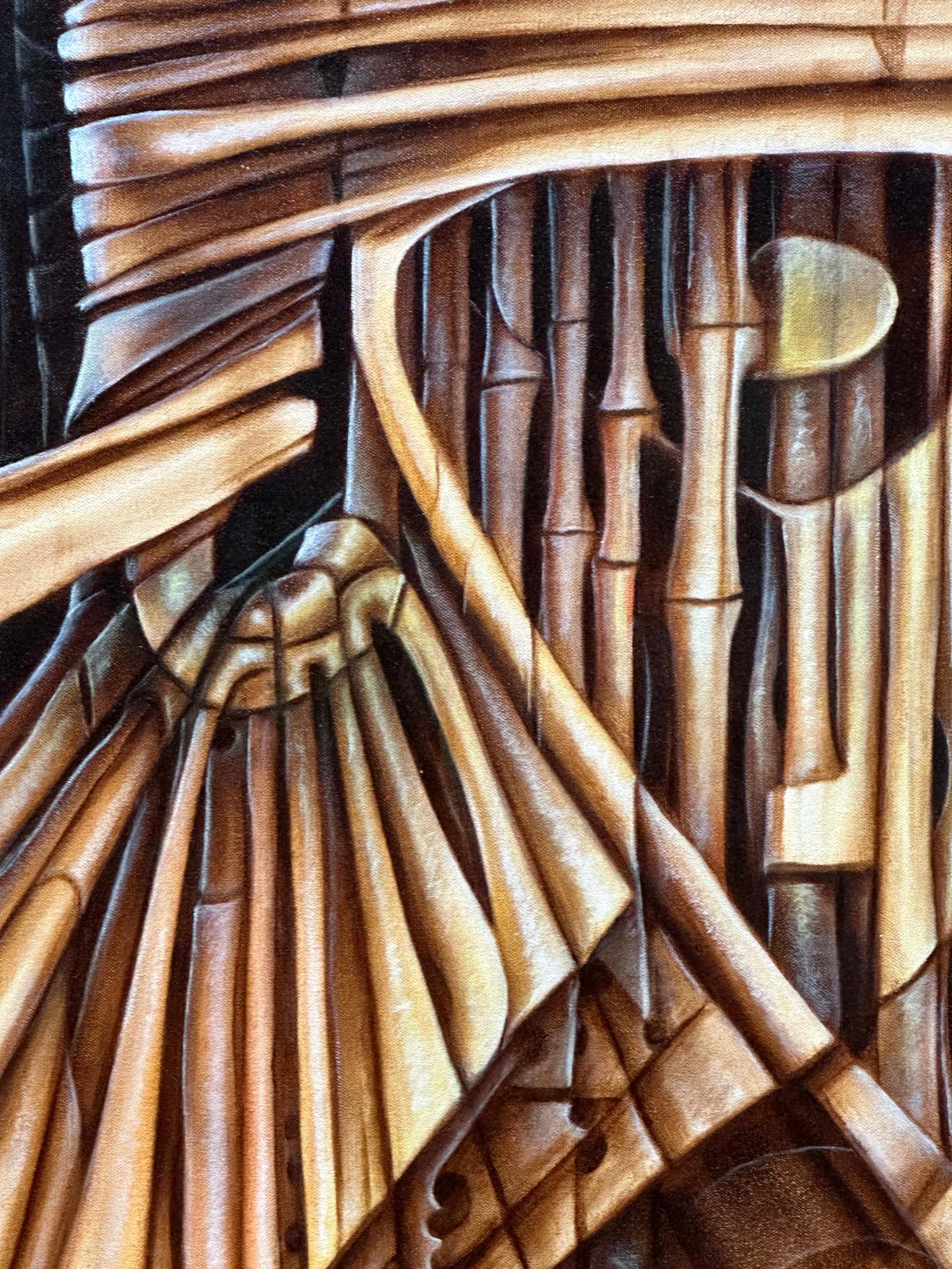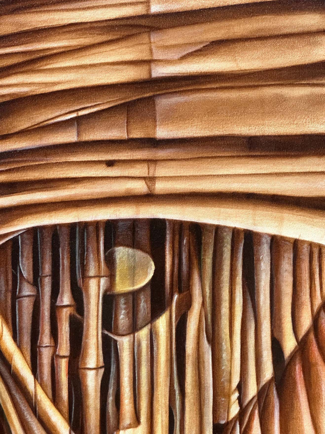 This organic painting depicts a close-up of a bench of bamboo, with each delicate stem and