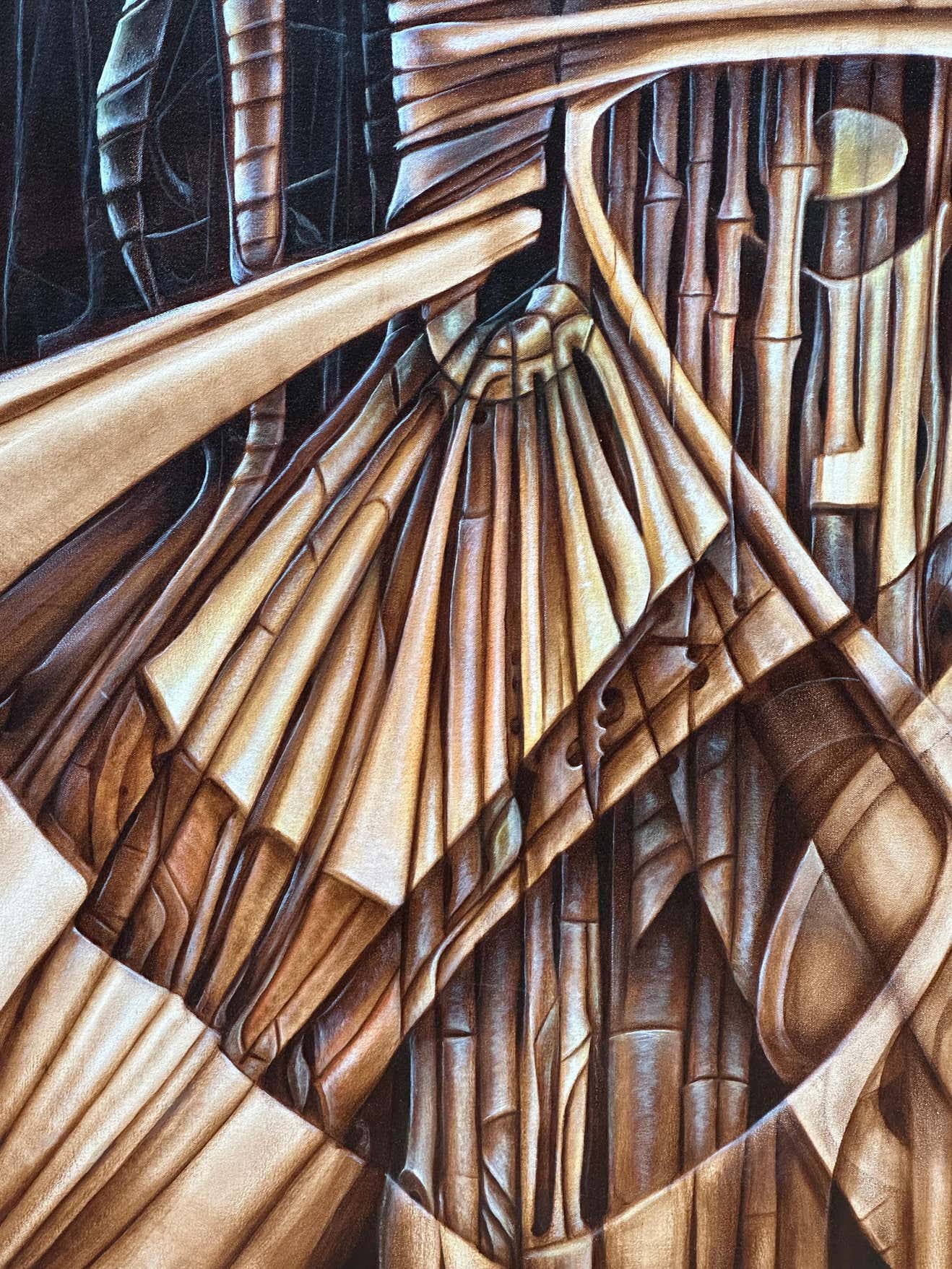 intricate knot carefully detailed by the artist using a honey-brown colour spectrum to generate