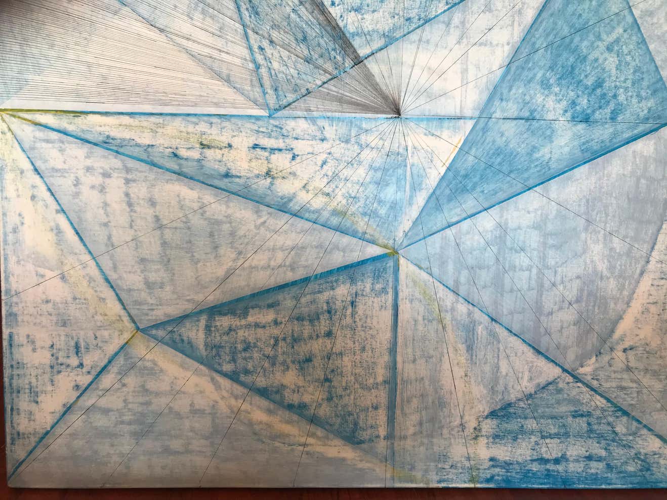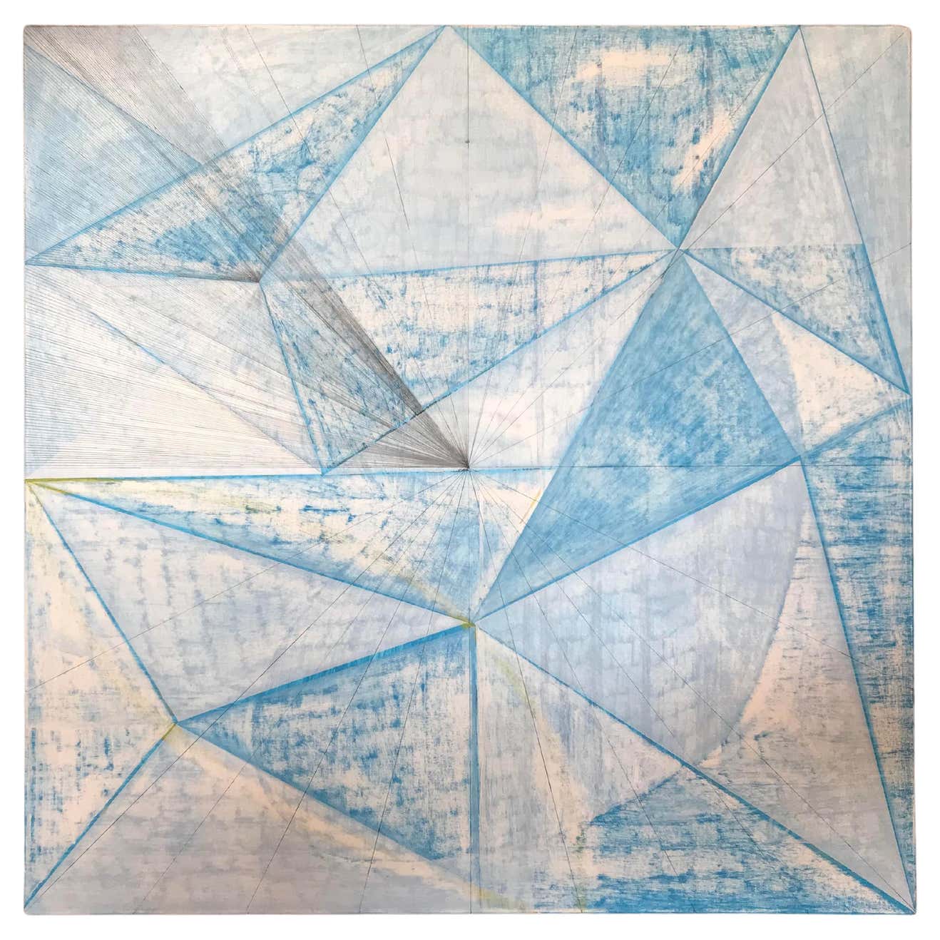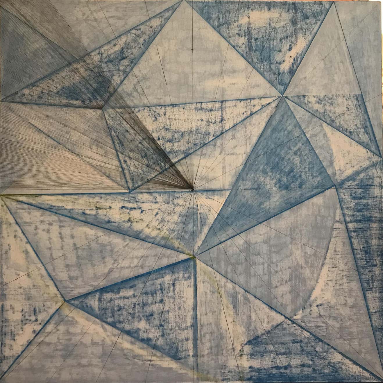 Wright crosses shades of blue and grey lines, reconstructing a sense of regularity obtained by the arrangement of different triangles sizes. The triangular forms used for the painting contrast with the perfect square shape of the artwork. It sits in a grey metal frame.