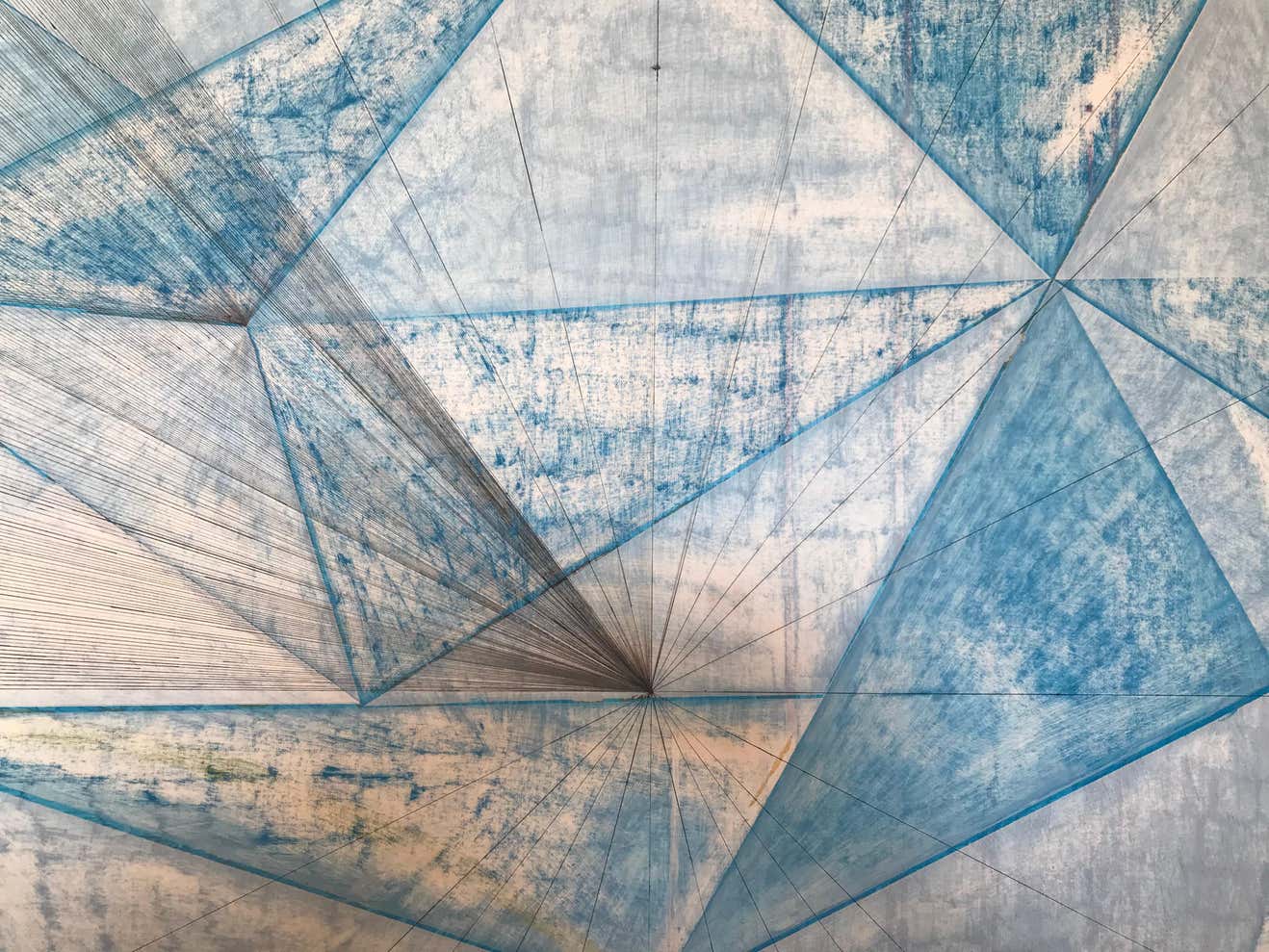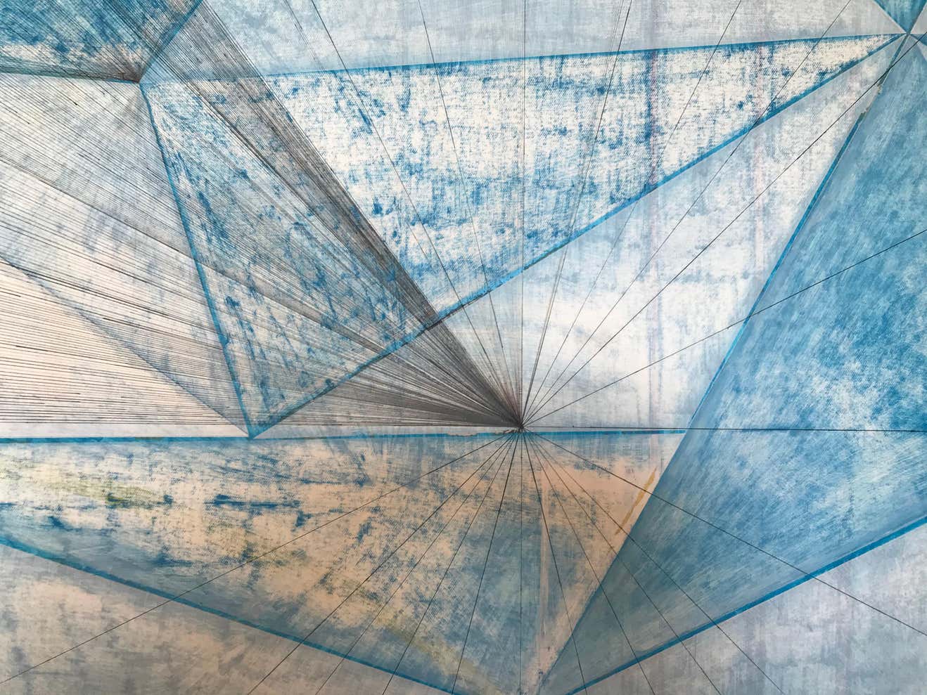 This blue monochrome painting by contemporary artist Mitchel Wright transports us to distant worlds beyond our comprehension. Within his seemingly infinite networks of lines, dots, and crosses, he decodes the recognisable to create something unfamiliar.