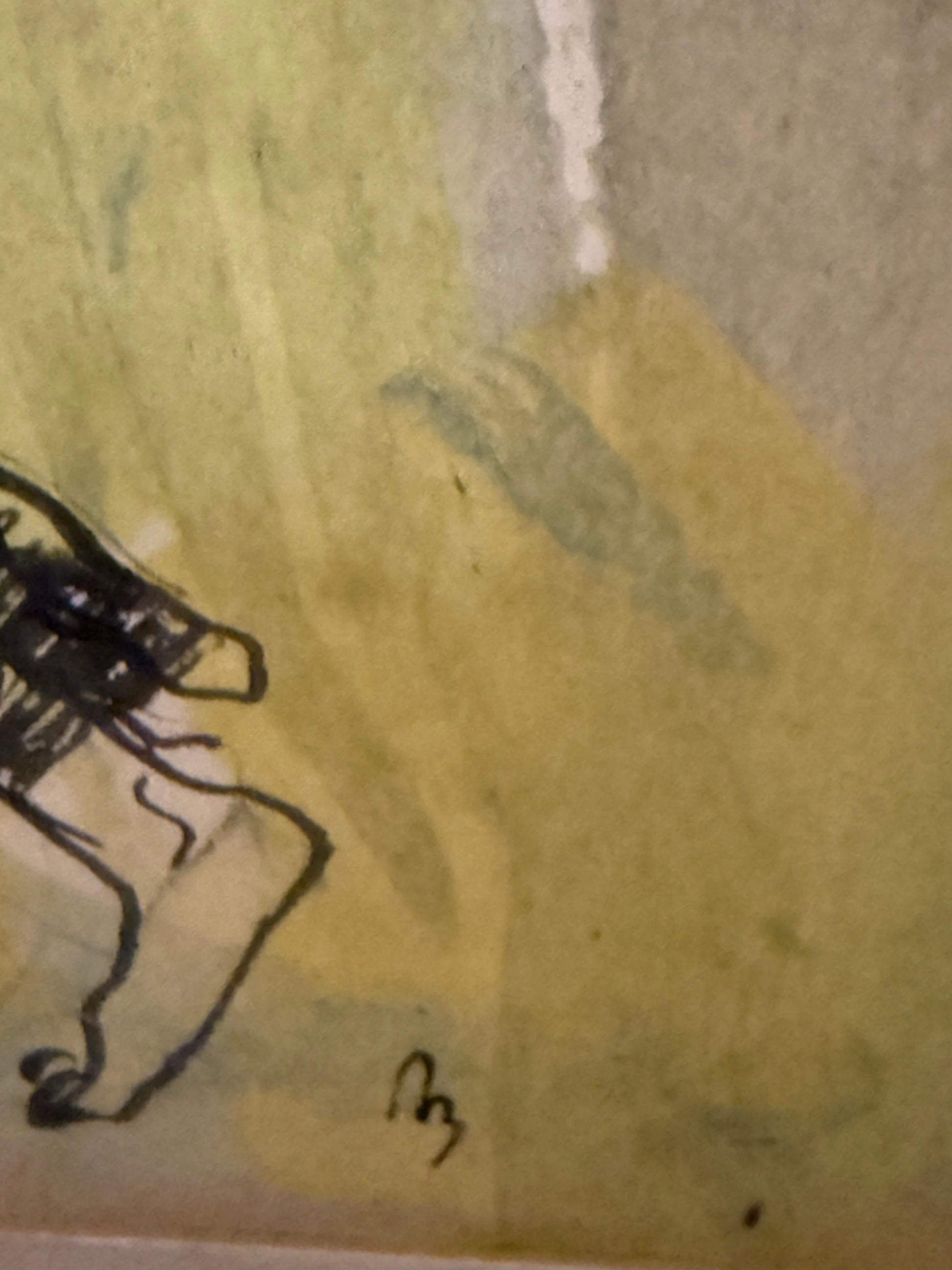 In this intimate ink-and-wash composition, Ron Blumberg captures the quiet dignity of a woman carrying a basket balanced atop her head. Loose strokes of watercolor—soft greens, ochres, and blush tones—create a diffused environment that surrounds the figure like an aura. The rapid, cross-hatched black lines that define her form reveal Blumberg’s deft hand and journalistic immediacy; the figure appears both fleeting and eternal.