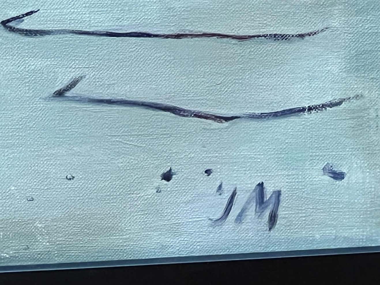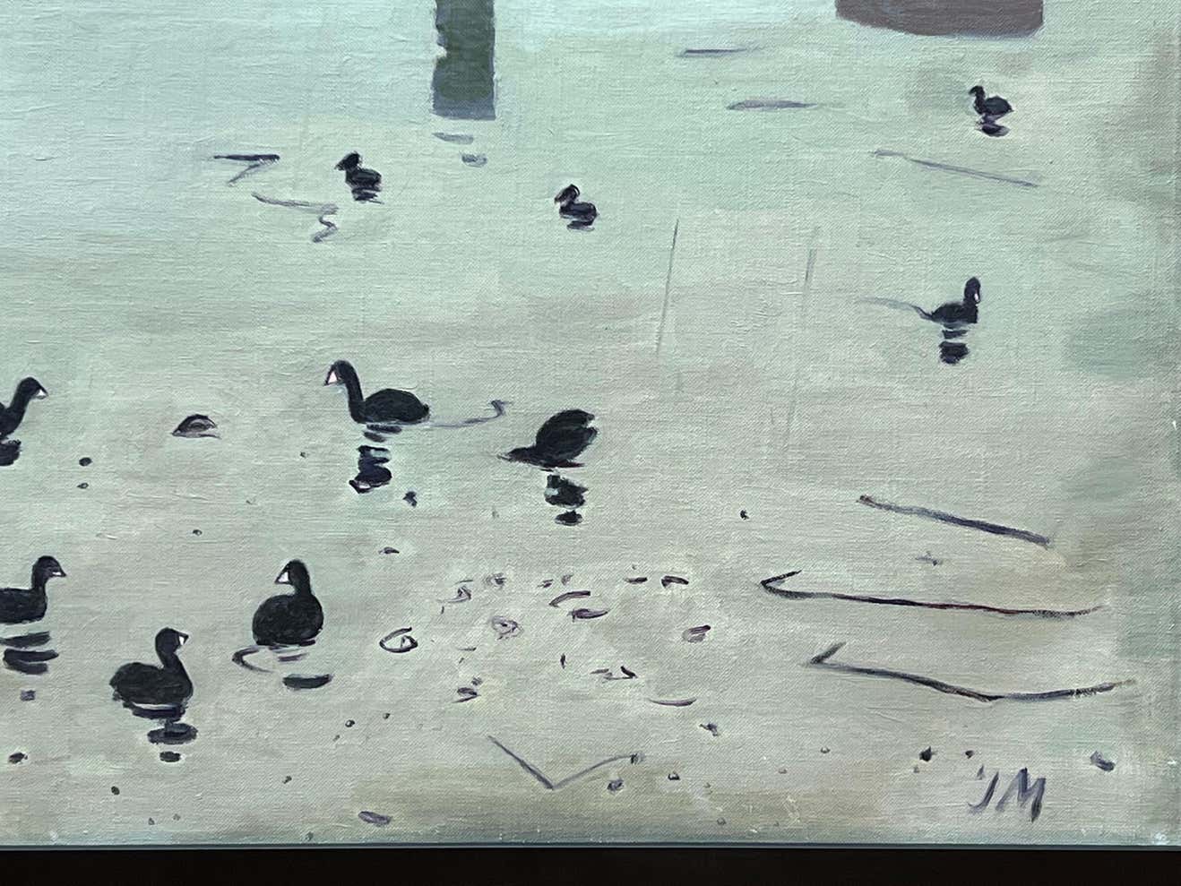This oil painting features a calm lake where eleven black ducks swim. The artist painted a water pipe on the lake's left bank while a palm tree stands alone at the center.