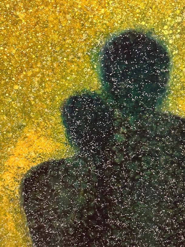 Against a backdrop of deep, brilliant yellow gold, two distinct zones emerge: the outlines of a shadow formed by a pair of human silhouettes, probably a couple, appear. The golden background plays an essential role in this oil by Dominique Dorie, enveloping the painting space and our perception with radiance, which is warm and comforting, as it is surprising in its contrasts. This choice of color alludes to gold, which, through the ages and artistic traditions, has become synonymous with divinity. It could be that the artist is using it to elevate love to the level of the sacred, transporting it from earthly planes to celestial heights. Small flashes of light, like stardust, illuminate the entire work. Moving beyond initial observation, we become active participants in a narrative woven by Dorie, authorized and encouraged to decipher the work's symbolism in a uniquely personal way. Isn't love and its infinite spectrum the center of everything, common to all human experience? The work exudes softness, something enveloping, held by these two figures protecting each other, and stopped in a moment of suspended time.