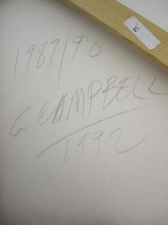Acrylic painting of a stylized mandala in yellow by artist Gerald Campbell dating from the late 1980s-early 1990s. Campbell, a celebrated California artist, was well-known for his large abstracts that prompt the viewer's own interpretation.
