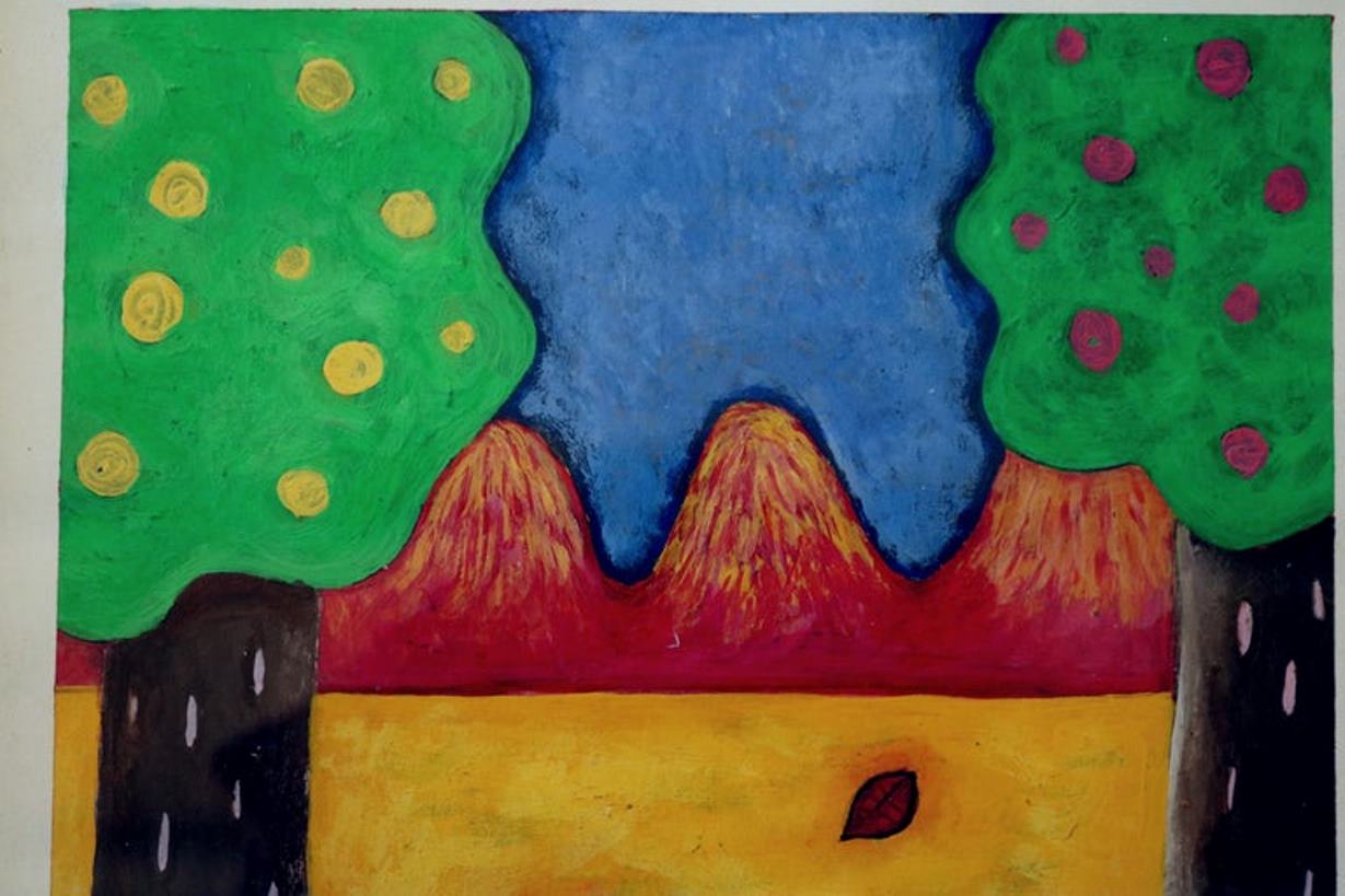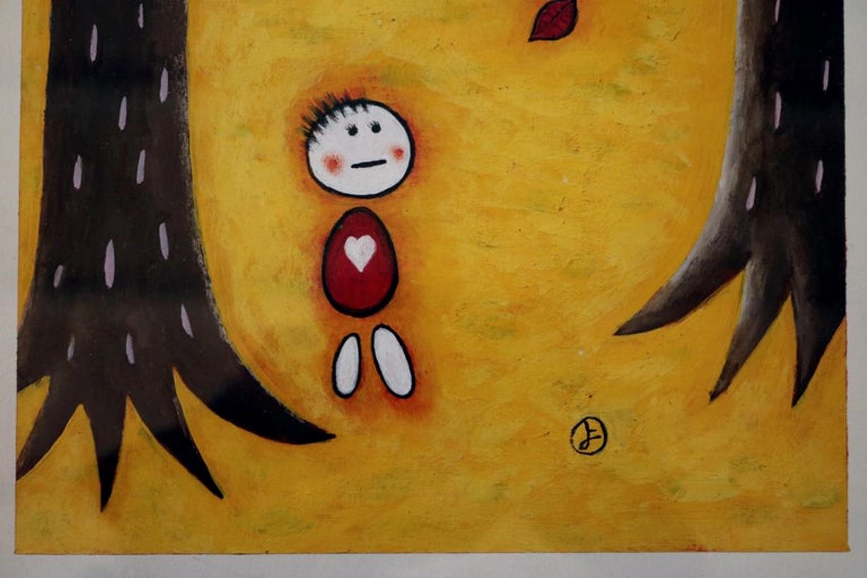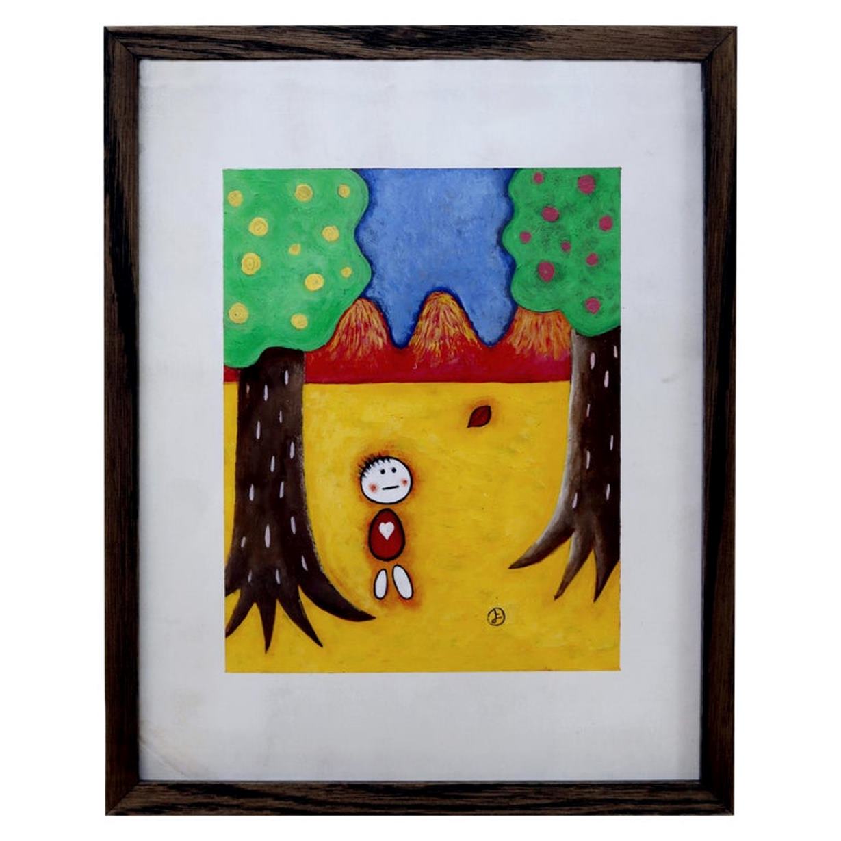 A whimsical yet sentimental scene by Yoshi Ueda with bright colors. It sits in a simple black wood frame. This is an early work of Yoshihiro "Yoshi" Ueda, a Japanese visual artist who went on to garner significant credits as a director for many globally renowned anime series such as Dragon Ball Z (including the original saga).