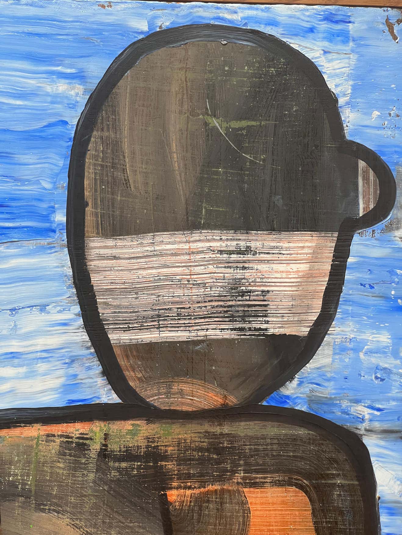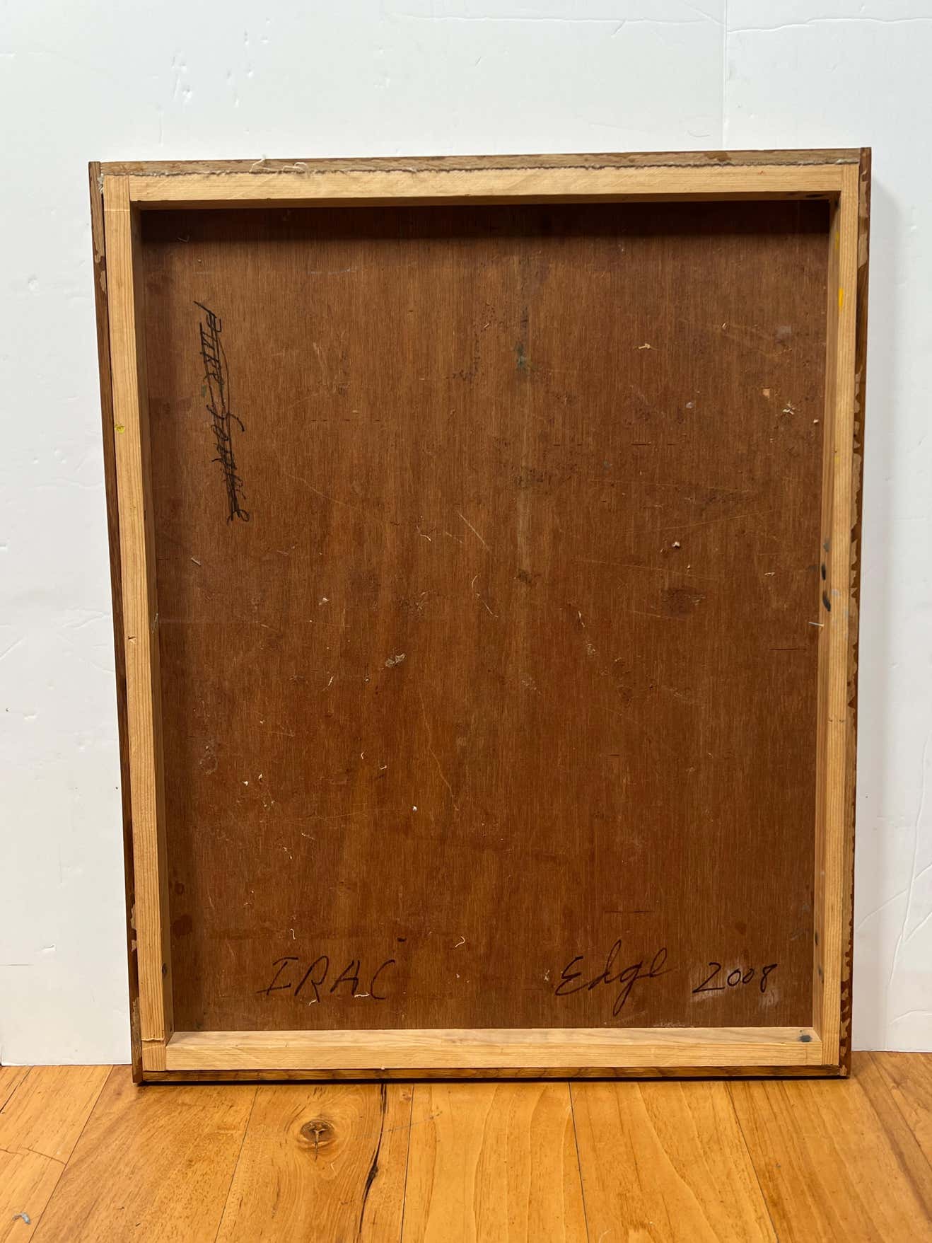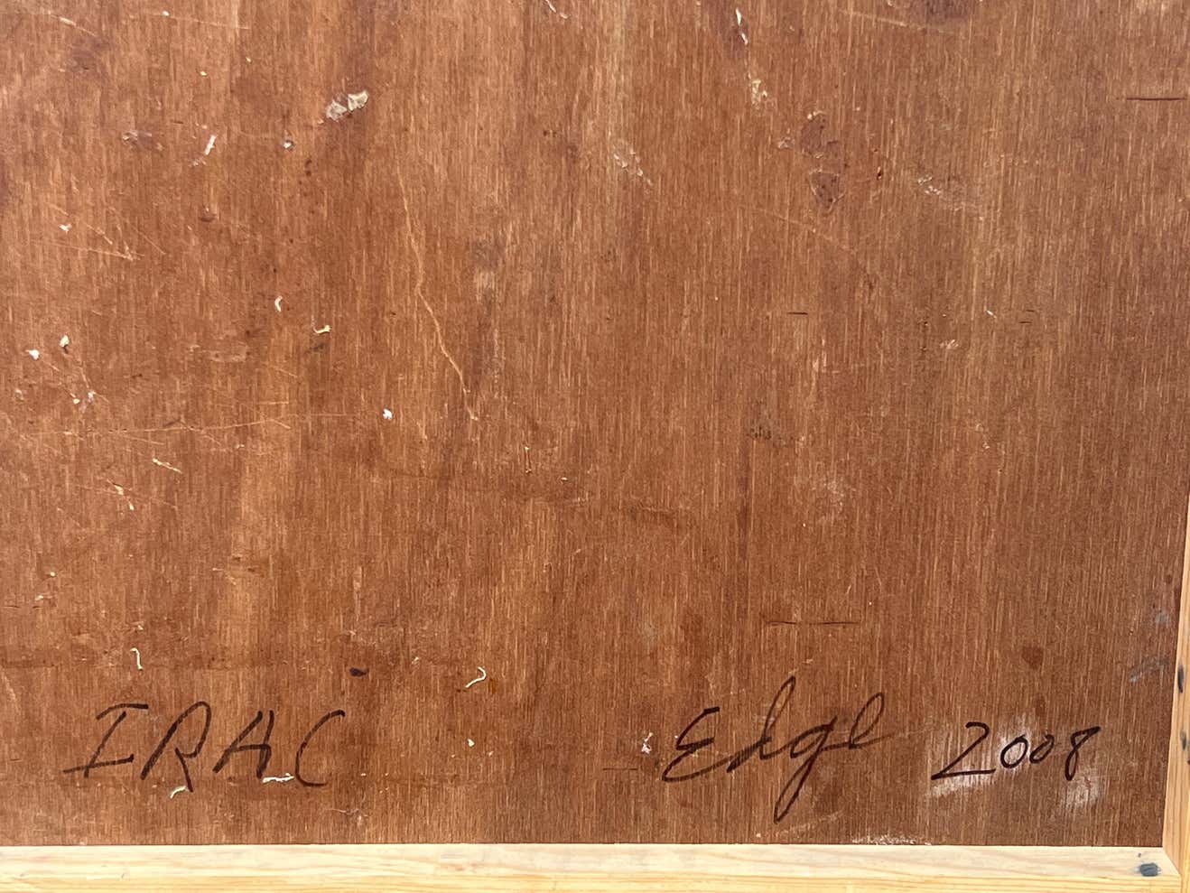 Using an ever-growing vocabulary of archetypal symbols, recurring shapes, and figures combined with vibrant color palettes; this particular painting showcases how Edge masterfully blends simple geometric forms - a square representing a bust and a round forming a head - and the word 'IRAQ' to challenge us brutally. Springing from the chest a hand striking like a fist expressing anger, calling for help, or pointing as one would like to point the finger at the person responsible for an unspeakable madness. The figure's lips are sealed shut with a large, sweeping brushstroke of white, the color symbolizing purity and peace that can sometimes only be found in silence or death. This gesture conveys the notion that regardless of how intense or traumatic what has been witnessed is, words cannot do it justice. The magnitude of its impact is too deep to be reported or even spoken of. We can note the use of orange which can express the bombings. The blue background provides a poignant contrast; exploding across the canvas like a beacon of hope.