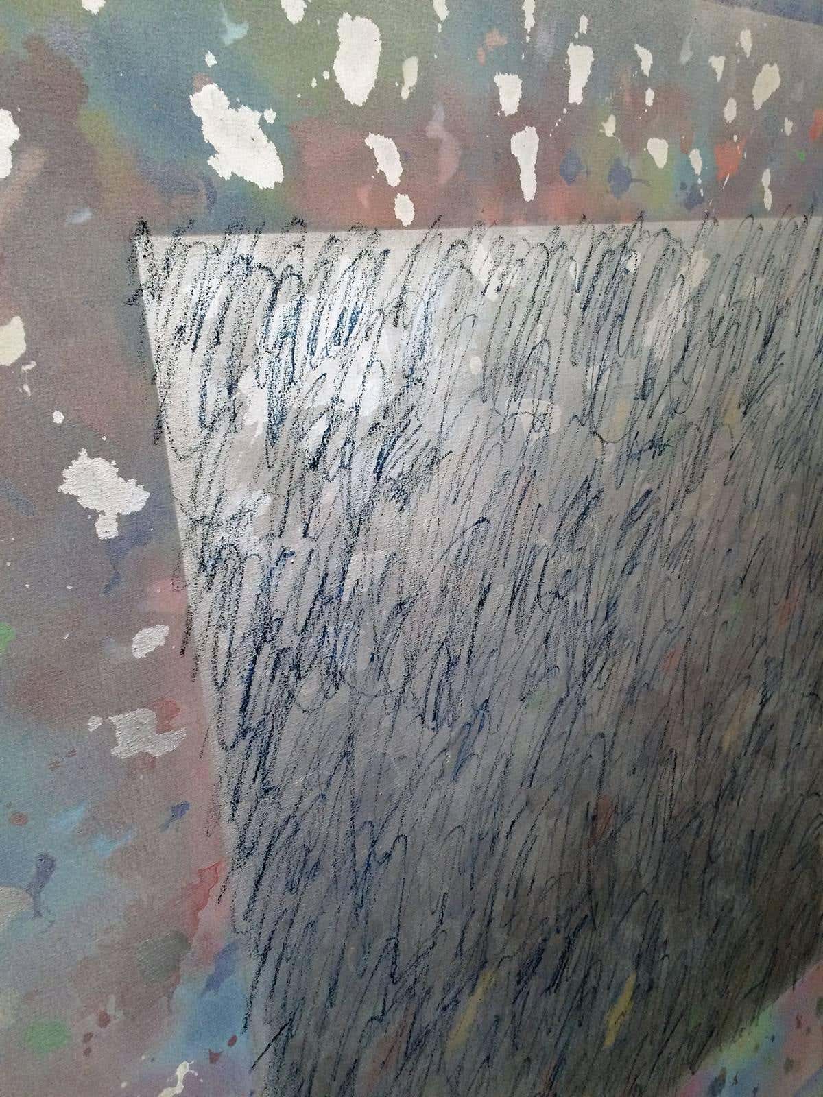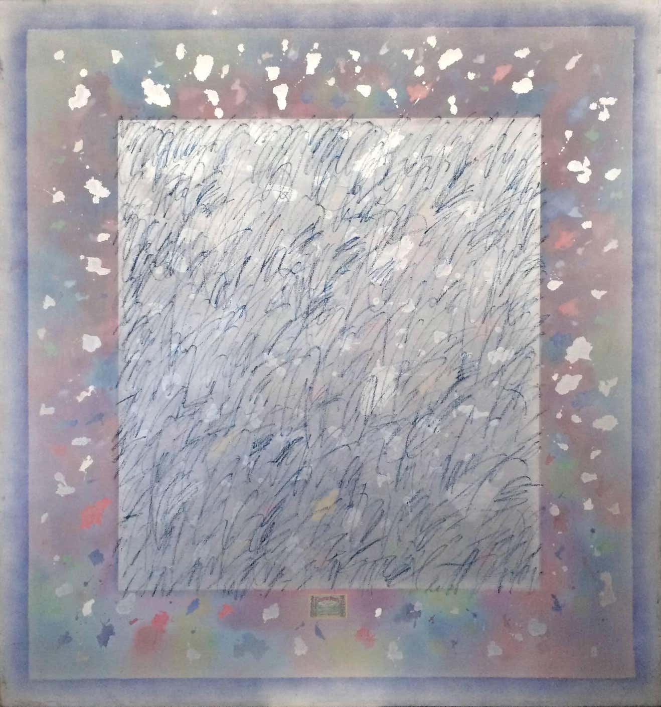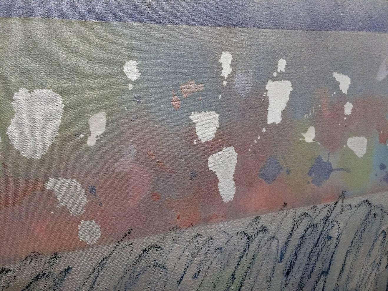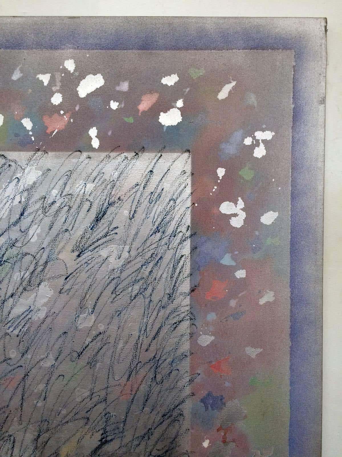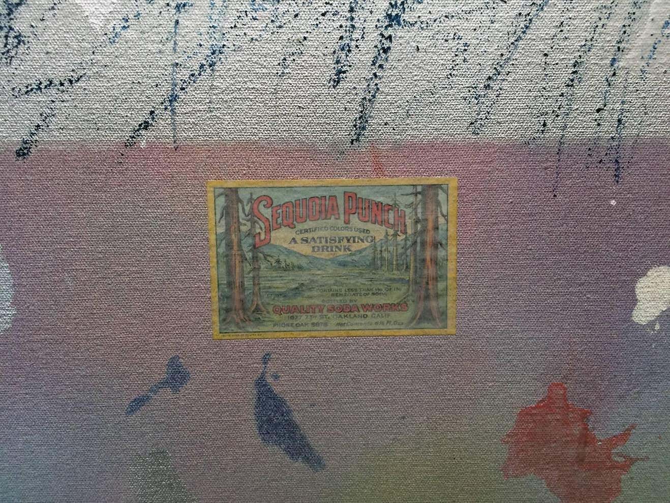 A playful large abstract painting at five and a half by six feet. Painting is made with acrylic, spray paint and one collage element, a "Sequoia Punch" soda label. The painting was made by Gerald Campbell, a celebrated California artist who was well-known for his large abstract canvases that prompt physical and visual interpretation.