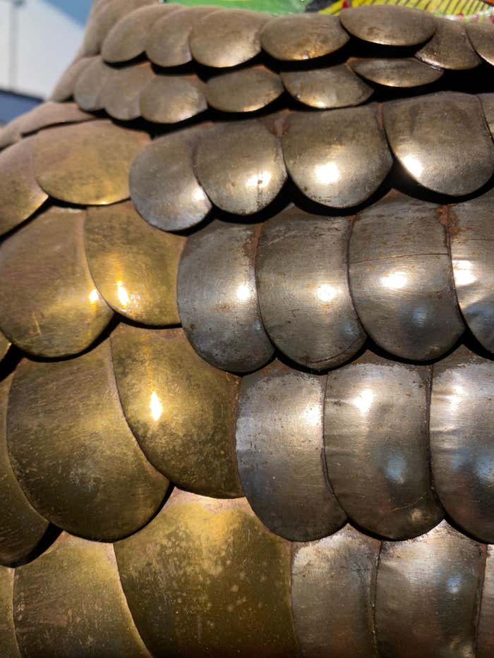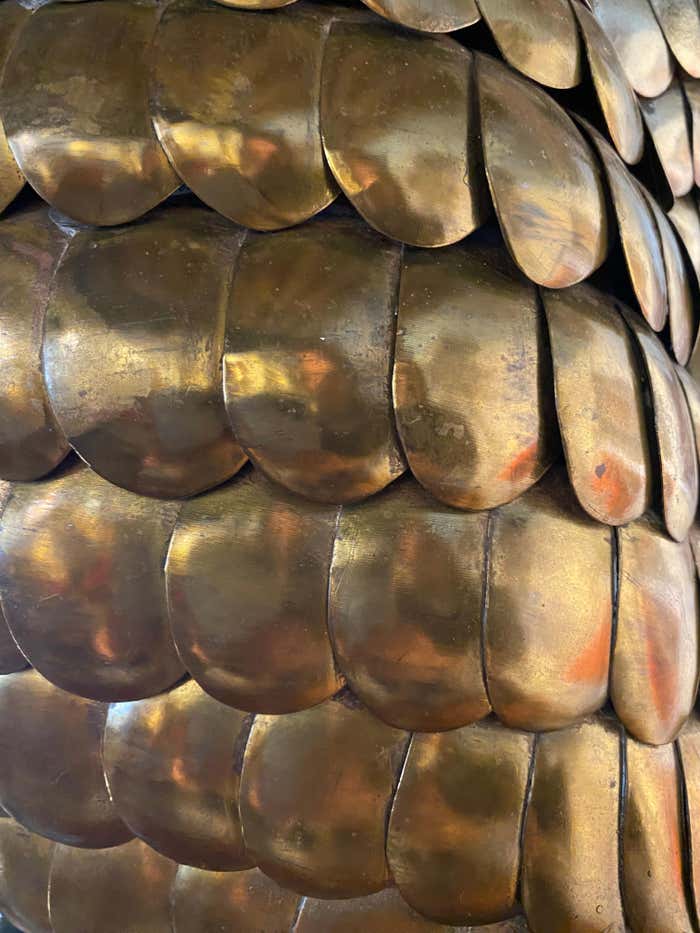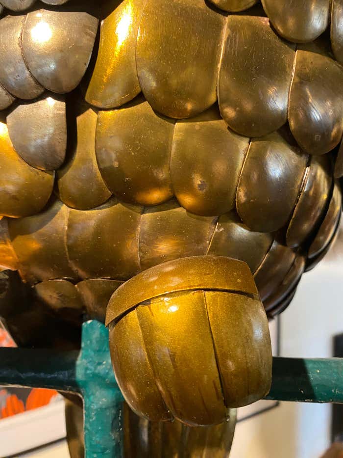 Hammered brass and copper, with dual patinas across the plumage, lend the piece a precious, artisanal quality. Each scale captures light differently, shifting between the matte patina of aged metal and the brilliance of sunlit gold. This contrast reinforces the owl’s duality as a nocturnal creature that carries a hidden light. Suspended without casting shadows, the sculpture takes on a floating, and ritualistic appearance.