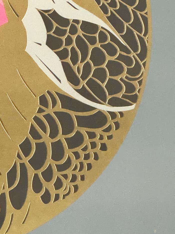 In this lithograph, Leal explores the theme of duality through two overlapping female profiles, elegantly contained within a circular frame. The first face, pale and withdrawn, gazes inward, while the second, vibrantly adorned with red lips and a crown-like headdress of gold and pink, projects outward with strength and allure. The composition is framed by feather-like motifs and geometric patterns, blending organic and ornamental elements.