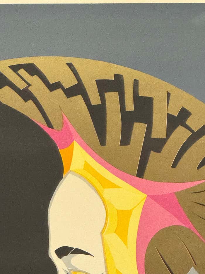 This piece, like others in Leal’s oeuvre, highlights the interplay of surface and meaning. The dual profiles suggest both conflict and complementarity—an archetypal pairing of inner and outer self. With its refined balance of color, line, and symbolism, the work bridges the decorative arts and fine art printmaking, embodying the era’s fascination with glamour, ambiguity, and psychological narrative.