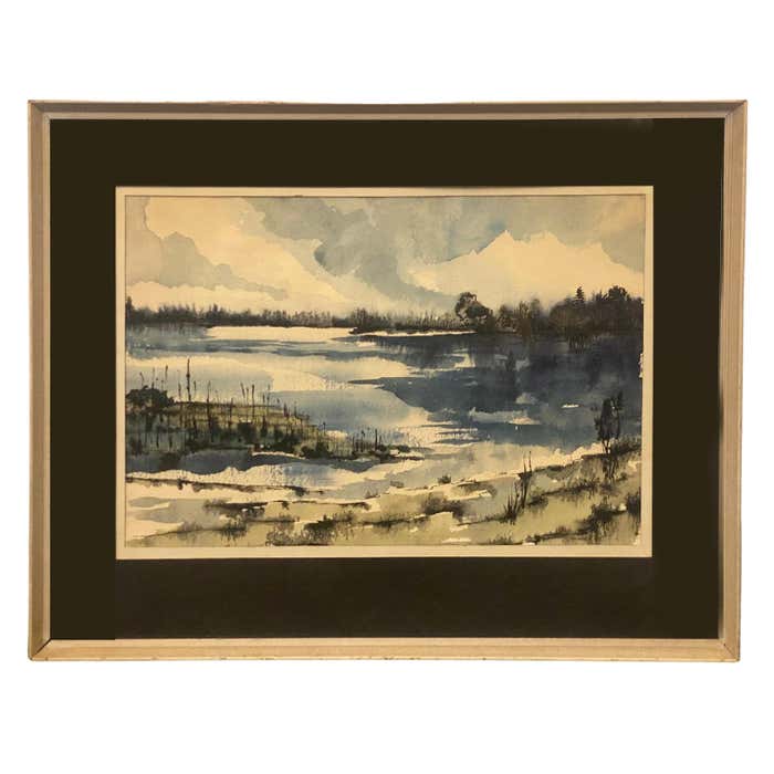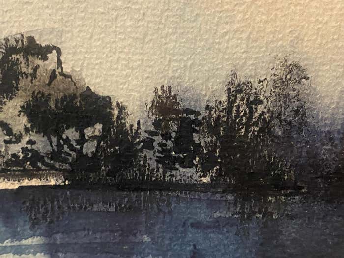 The composition centers on a lake, edged by the silhouettes of trees and thickets, stretching beneath a sky laden with clouds in shades of gray and white, hinting at a twilight or dawn suspended in time. The horizon line rises subtly. The sky’s reflection in the water serves as an echo, amplified by fluid brushstrokes, a hallmark of watercolor. This technique, allowing the paper’s grain to shine through, lends an airy, almost ethereal texture. Deep blacks contrast sharply with soft blues and pale grays, carving sparse branches like exclamation marks that might evoke the solitude of a world apart. Each dark stroke seems to bear the weight of an ancient memory.