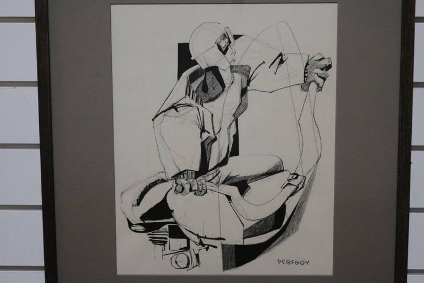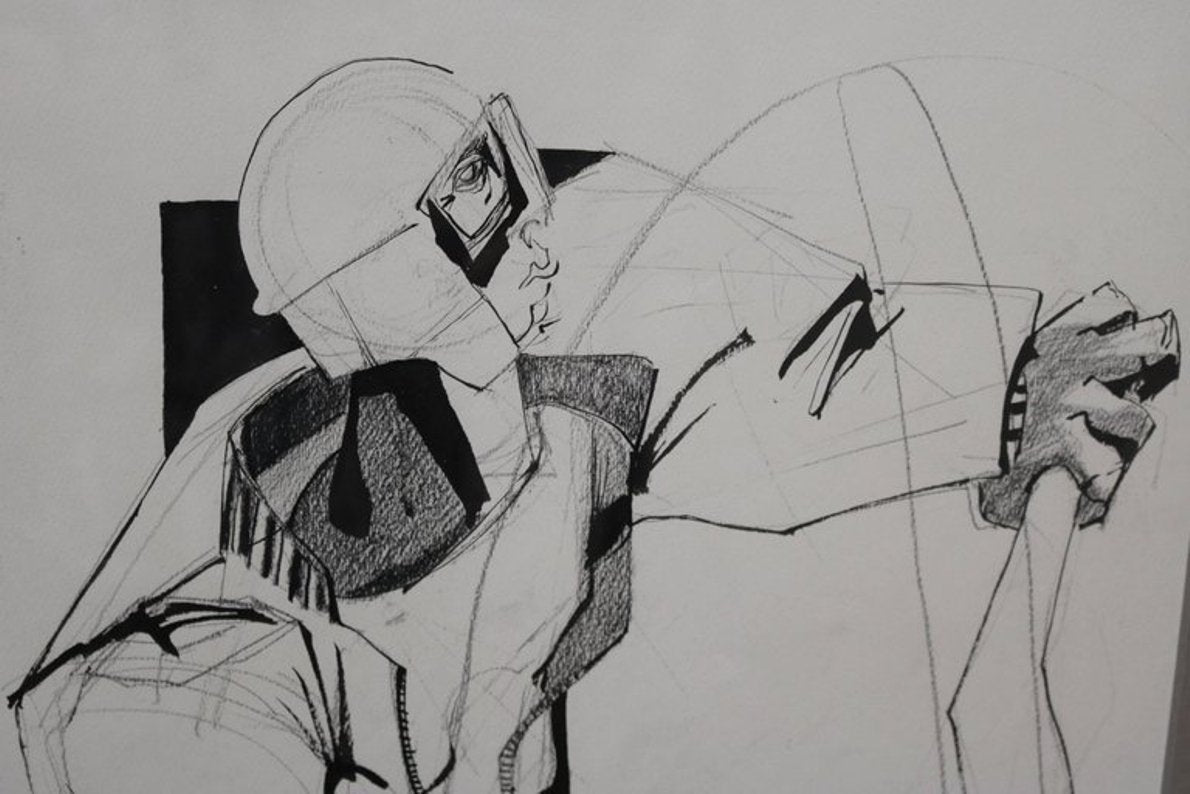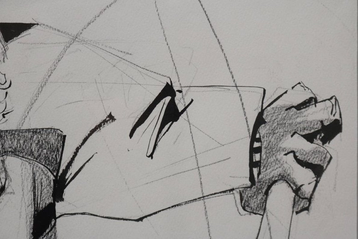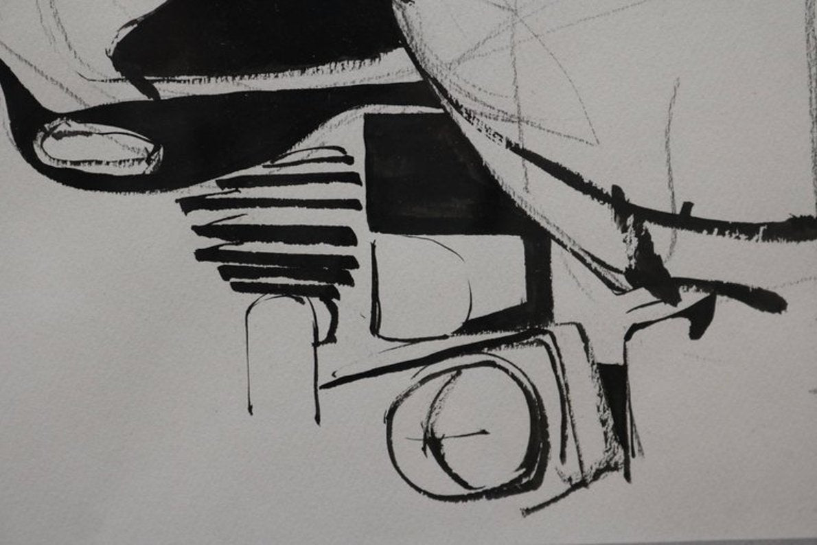 This newly reframed drawing of a motorcyclist is done in charcoal, ink and pencil on paper and is from his later body of work.