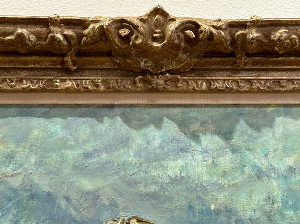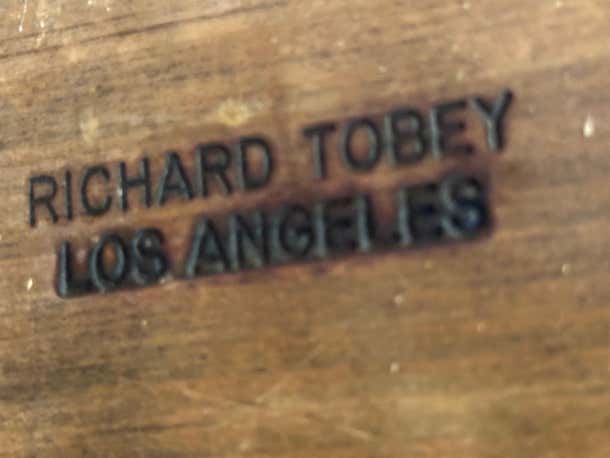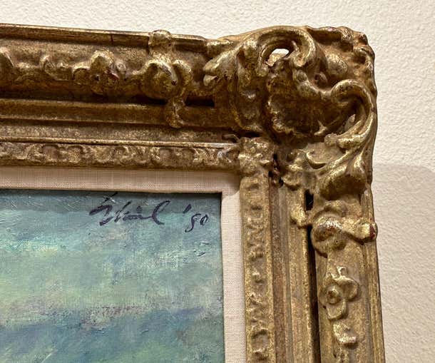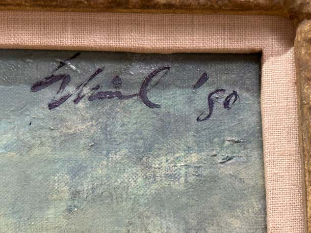 The painting is eligible, signed in the top right corner, and dated 1980. It sits in a hand-carved frame with a water-gilded panel made of genuine 22k gold. t. The back of the frame is stamped " RICHARD TOBEY - Los Angeles"