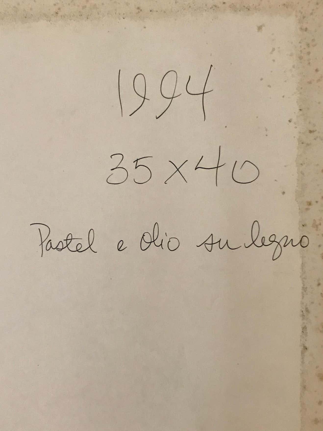 The artist used oil pastels to feature a yellow crying character sketched with curvy long black lines.