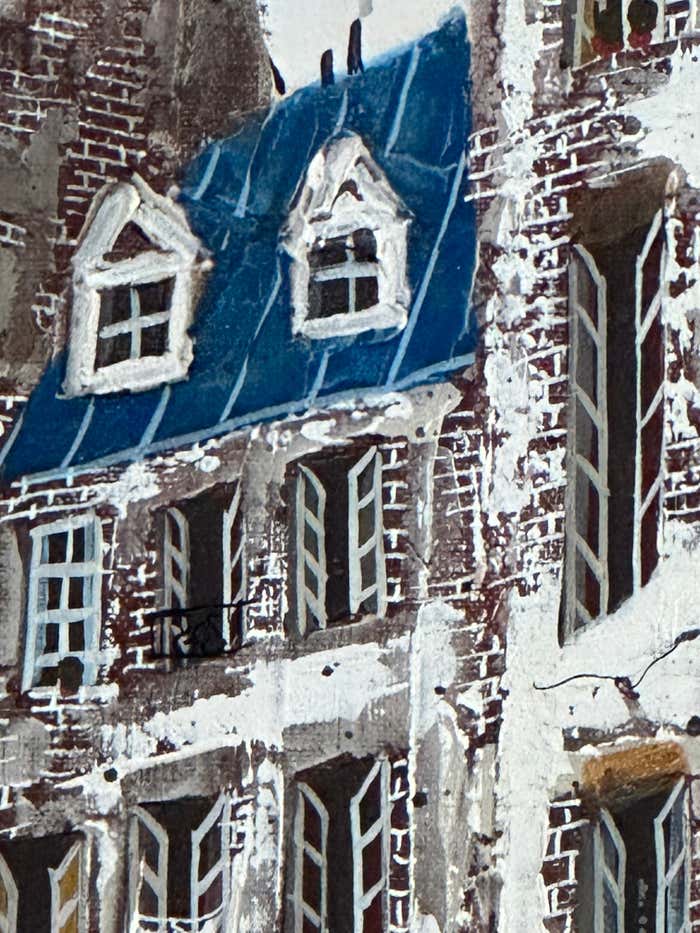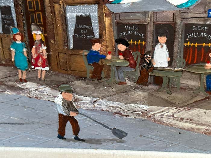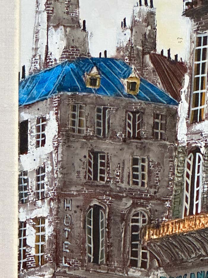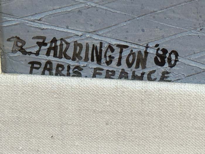 What distinguishes this work is the unique perspective of a foreign painter who possesses a deep affection for Paris, having once resided in the city. Decades later – specifically, 30 years later, as the canvas was created in 1980 – he chooses to convey living memories stored in his heart (or in his photographs), creating a visual narrative pulsating with moments from his youth in Paris. Farrington selects Les Halles, aptly referred to as the "Ventre de Paris" during the 1950s, a location of unparalleled centrality. With an intimate understanding of post-war Paris, he captures in this Artwork hotels, signs of various craftsmen, hand-painted signs, a few clients seated at a terrace, and various animated characters along the street, all rendered with meticulous, lifelike precision, introducing bright colors into the signs for example, and some other details, subtly illuminating a painting almost out of a scene from a vintage black-and-white film. This painting unfolds a vivid and immersive story, one into which any observer can project themselves. It photographs a moment of simplicity and carefree post-war elation, a juncture when Paris was undergoing reconstruction while safeguarding its distinctive charm.