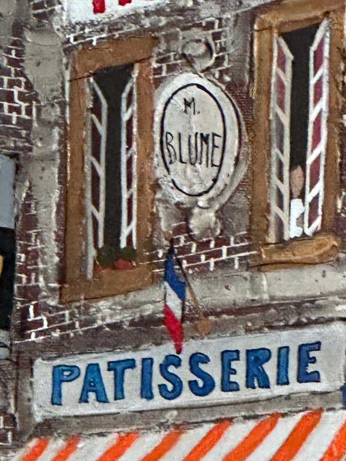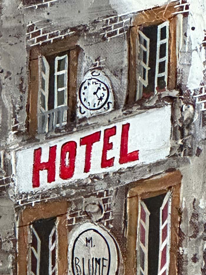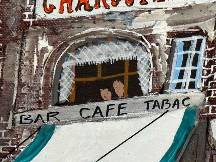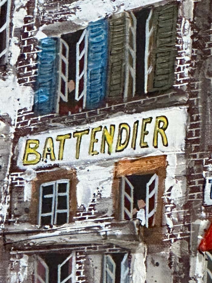 As the viewer gazes upon this artwork, they are instantly immersed in the ambiance of a food trade street, and especially the familiar historic brasserie “Au Pied de Cochon” - the sole establishment in the painting that still exists nowadays - and its surroundings at the heart of the bustling Halles district. At "6 Rue Coquillère", the act of opening the doors, each adorned with handles that resemble pig's trotters, transports one through a temporal gateway into the quintessential French world of "la cochonnaille"... The renowned "Pied de Cochon" restaurant made its debut in 1947. In its early days, it became the preferred gathering place for the "Forts des Halles" – the diligent laborers who tirelessly transported goods through the pavilions of the old Halles de Paris. From these dedicated workers to the luminaries of the time, this establishment emerged as a symbol of Parisian life. Farrington reconstructs a scene around this restaurant, nourished by her own Parisian experience when he was a young American living in France. An iconic Brigitte Bardot poster graces one of the walls in the lower right part of the painting, offering another vivid symbol of this legendary Paris. The scene includes a manually operated 1950s vehicle, a street sweeper, and a variety of other restaurants and hotels, such as El Greco, Battendier, Tabac des Halles, and many more, all gone today.