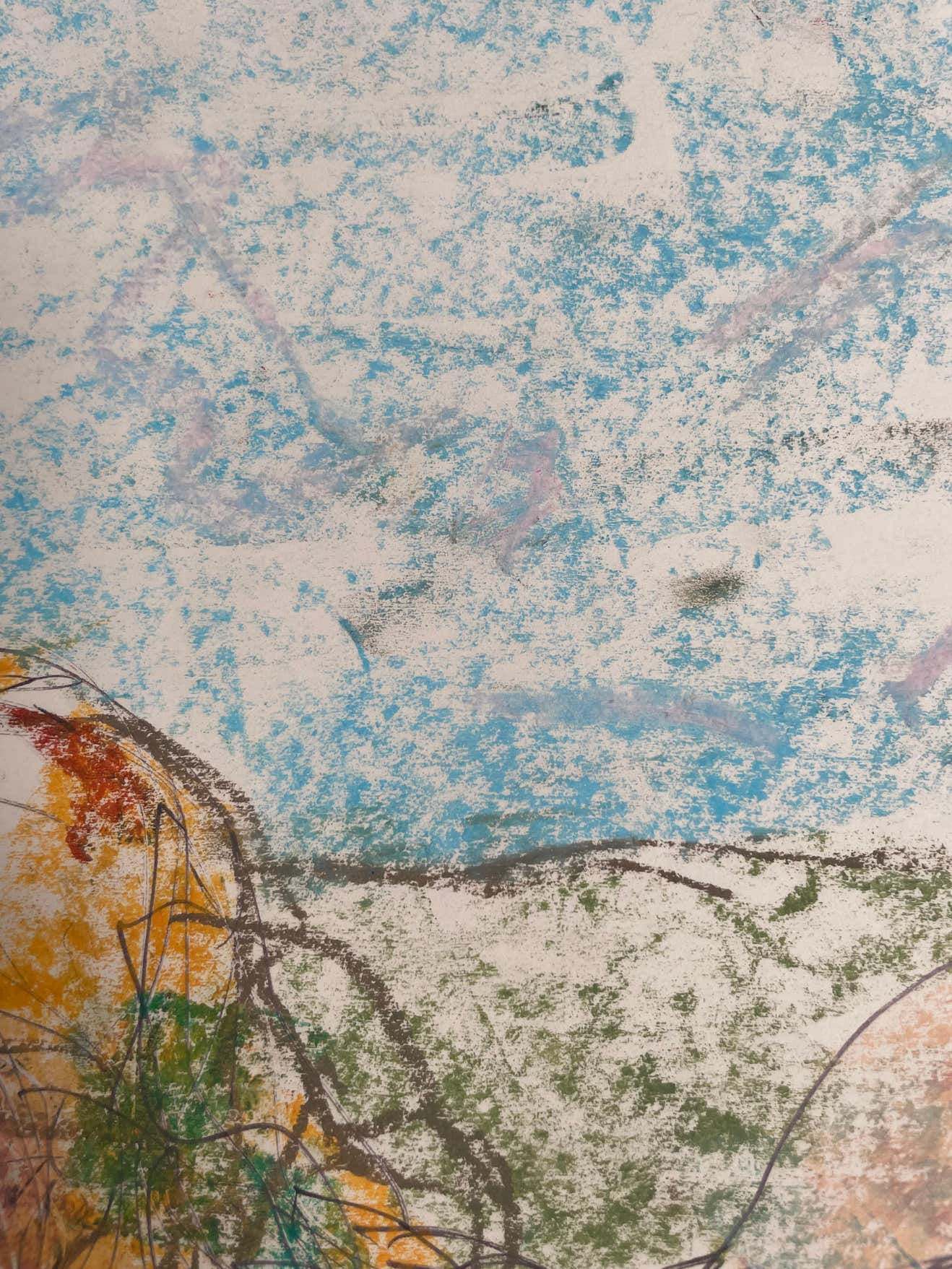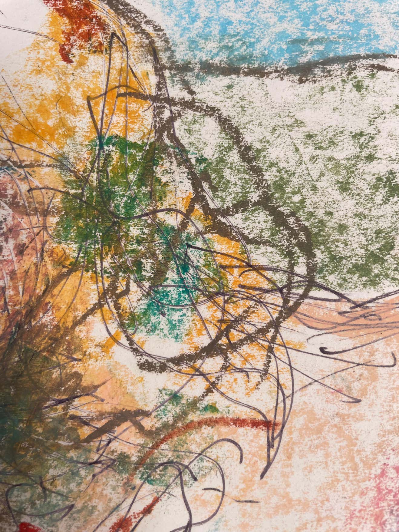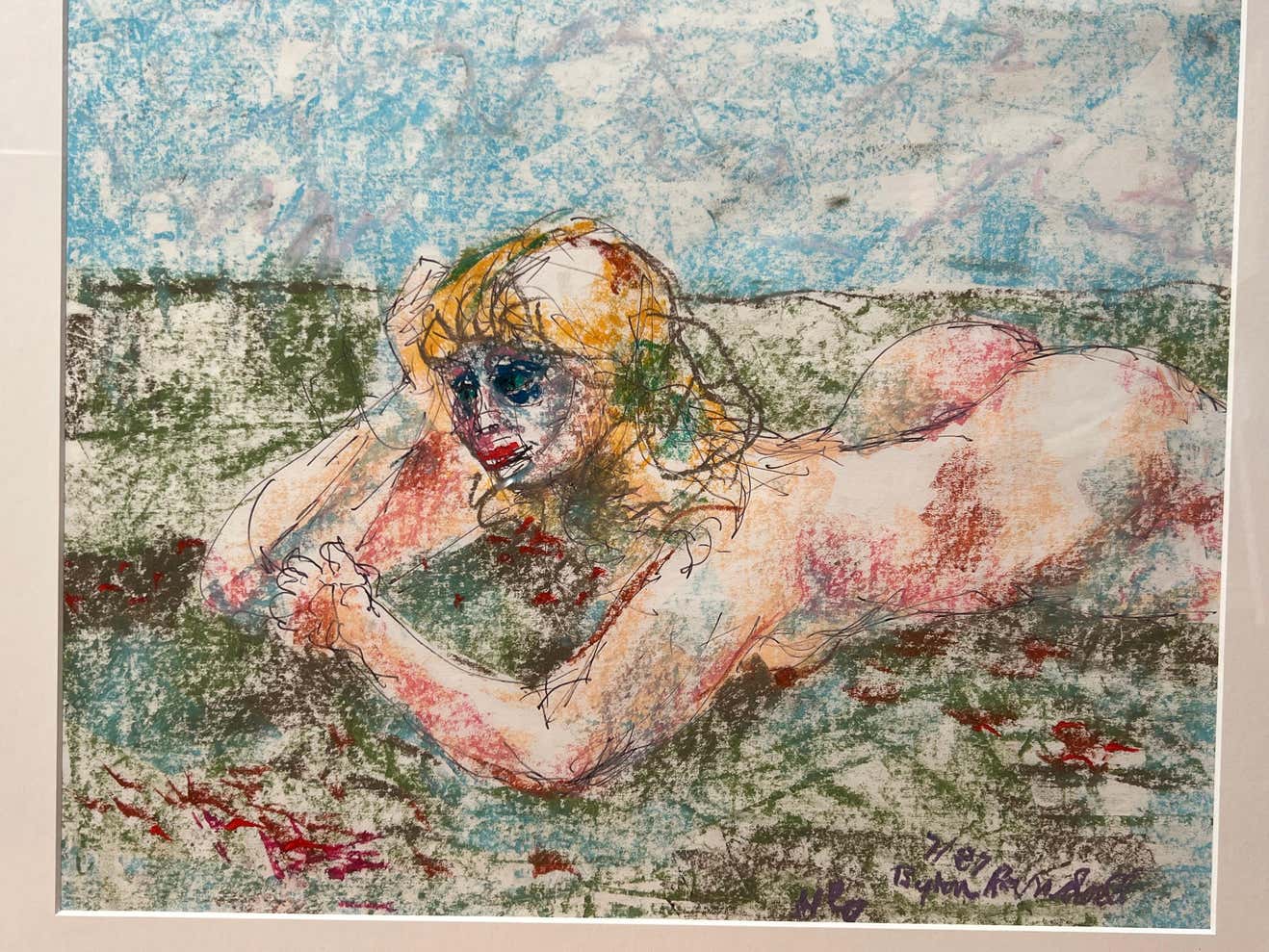 Playful nude created with pastels on paper. This sketch-like drawing shows a woman wearing dramatic blue eyeshadow and full red lipstick while lying naked in a meadow.