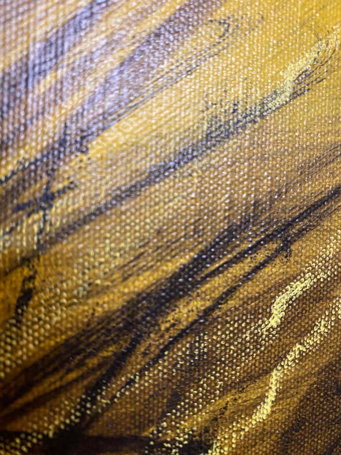 The artist plays with verticalities and diagonals. The fine, nervous grasses dart about in unpredictable directions, driven by a wind that we can guess without seeing. This contrast between the suggested movement of the grasses and the pigeon's attentive immobility lends this acrylic work a restrained tension, like a breath held in pause. The chromatic palette, reduced to the essentials, reflects a chosen austerity. The dark, earthy tones of the foreground unite with the deep gray of the bird, while the background, bathed in misty yellows, blurs the boundaries between sky and earth.