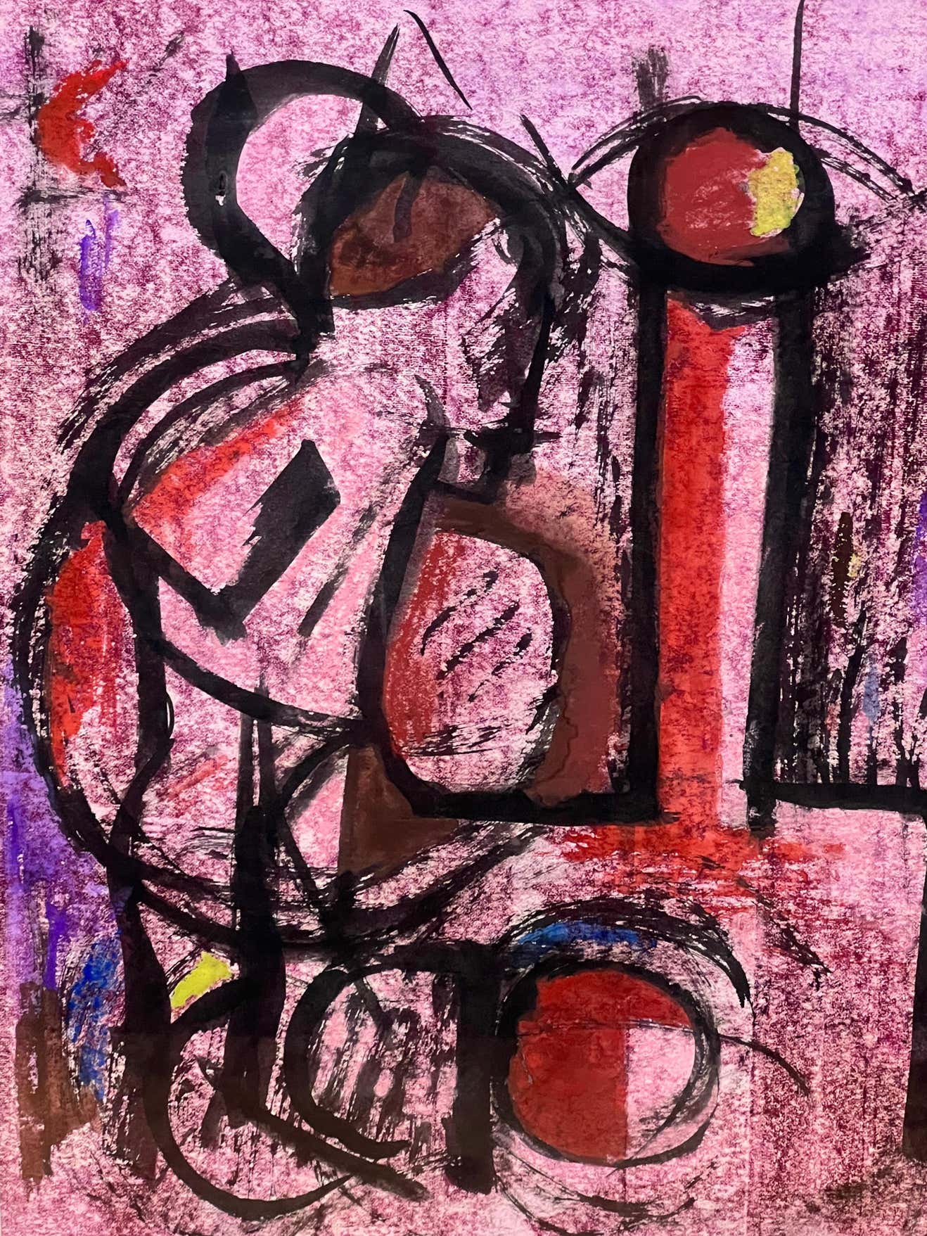 The dominant colour is a striking pink, which immediately draws the viewer's attention, while the black and red hues add a sense of contrast and depth. The brushstrokes are light, creating an impression of movement and fluidity. The brown undertones provide a sense of grounding to the composition.