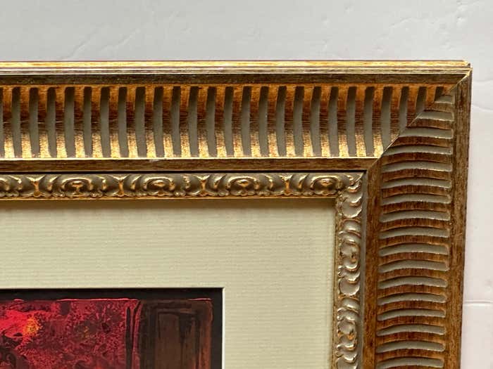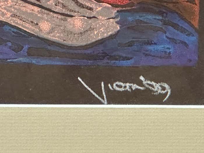 Dated in 1999, the signature is illegible, this unique piece is accentuated by a delicately gilded and striped wooden frame.
