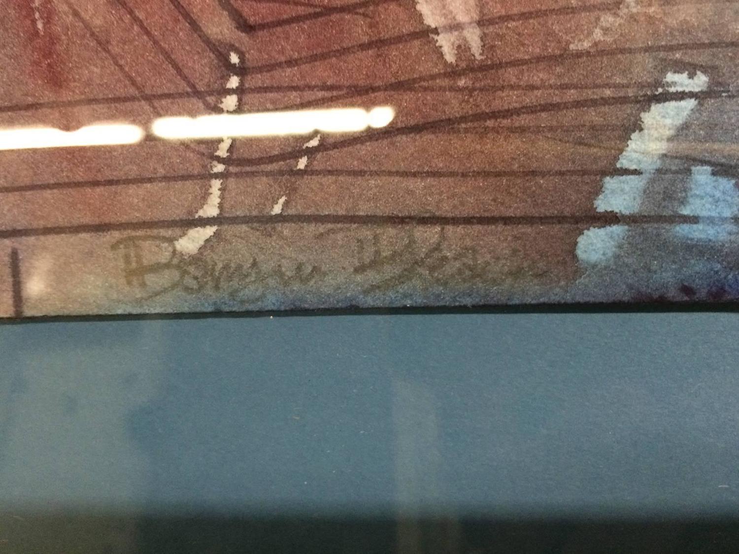 Abstract watercolor in warm colors and felt tip marker on paper. The piece is framed in a black lacquer wood frame and mounted on a blue mat background. Signed and dated 1979.