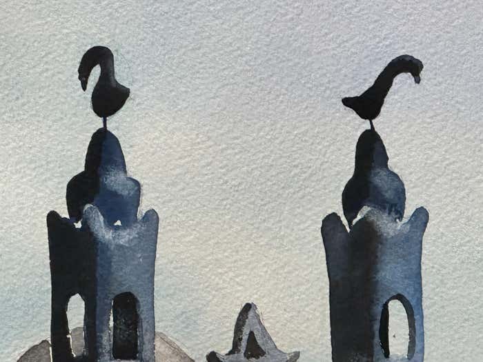 Two trinkets featuring, the first one, an imaginary church with 4 big threatening birds standing guard, two on the 2 church towers, and two in front of the door. Behind this, we can perceive the shape of a big kettle. These surreal objects stand in front of a window, therefore inside a house. They rest on a small green carpet mimicking a meadow's grass.