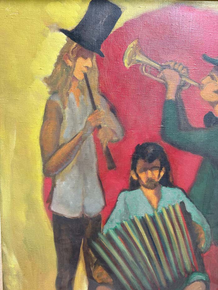 The painting depicts three musicians with flowing hair, playing the clarinet, trumpet, and accordion. The stylistic approach emphasizes atmosphere over meticulous realism, evoking a universal experience of communion through music. The musicians symbolize a movement that found solace and unity in music, and their style reflects a countercultural rejection of contemporary fashion.The brushstroke, the most tactile element in painting, is used here with a generosity that permeates the entire scene. The background, dominated by an omnipresent red occupying more than two-thirds of the canvas, is surrounded by yellow pulses with the sun's energy. The sense of spontaneity and improvisation in the representation of the musicians recalls the improvised nature of jazz and rock, genres that dominated the cultural scene of the 1960s and 1970s.