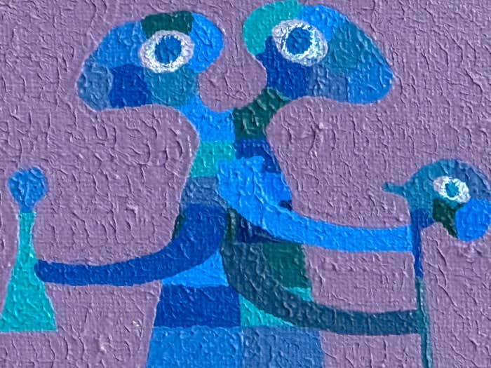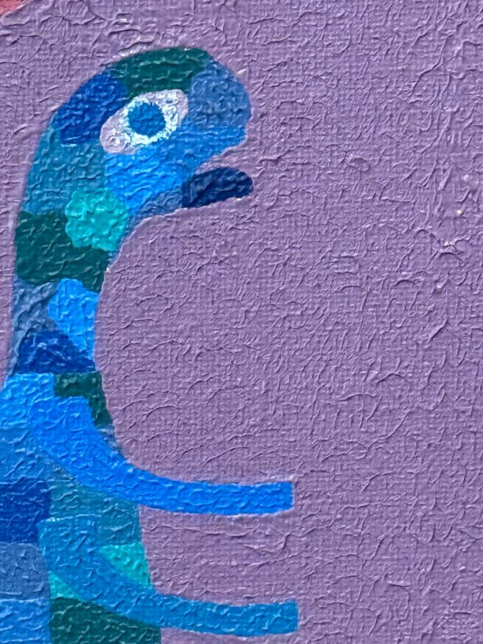 Divided by a diagonal axis, this composition features three abstracted, creature-like figures rendered in layered tones of red, blue, and green. Their lively gestures and simplified anatomy evoke both playfulness and myth, while the muted mauve and olive background introduces an unexpected tranquility. Tschopp’s use of color fragments to model form reveals his interest in rhythm and repetition, reminiscent of early Op Art and West Coast Hard-Edge painting.