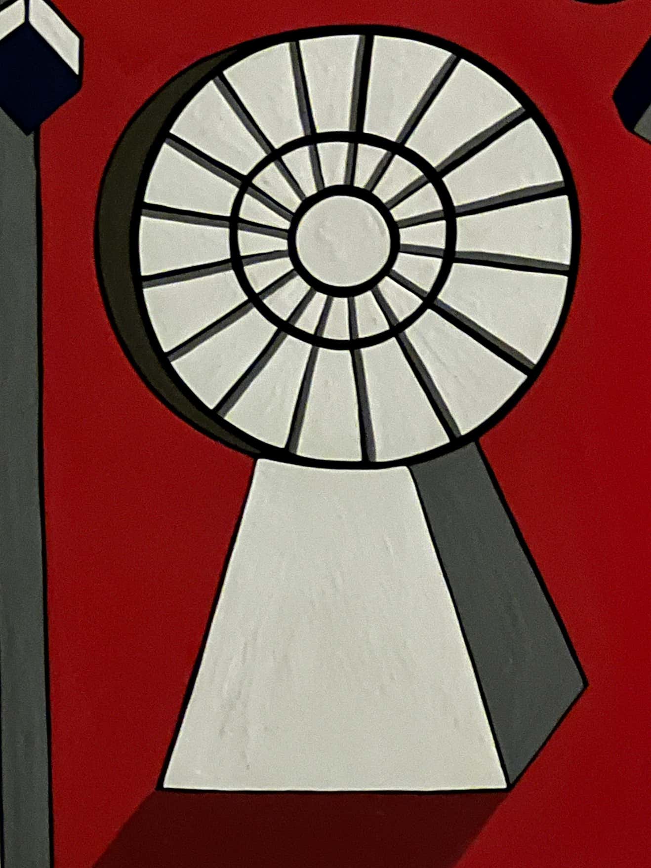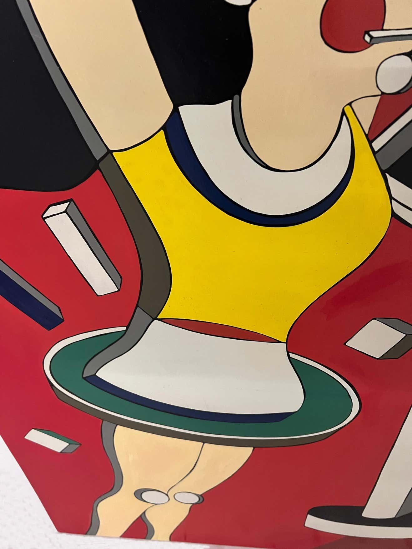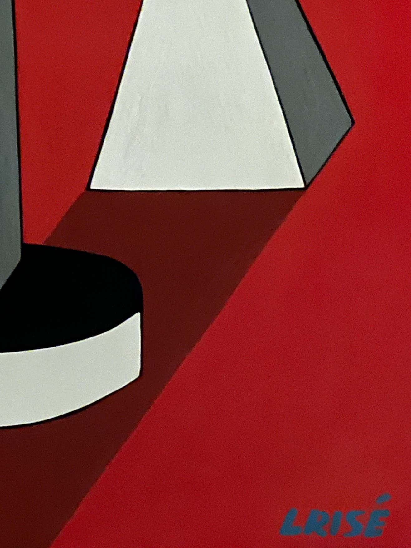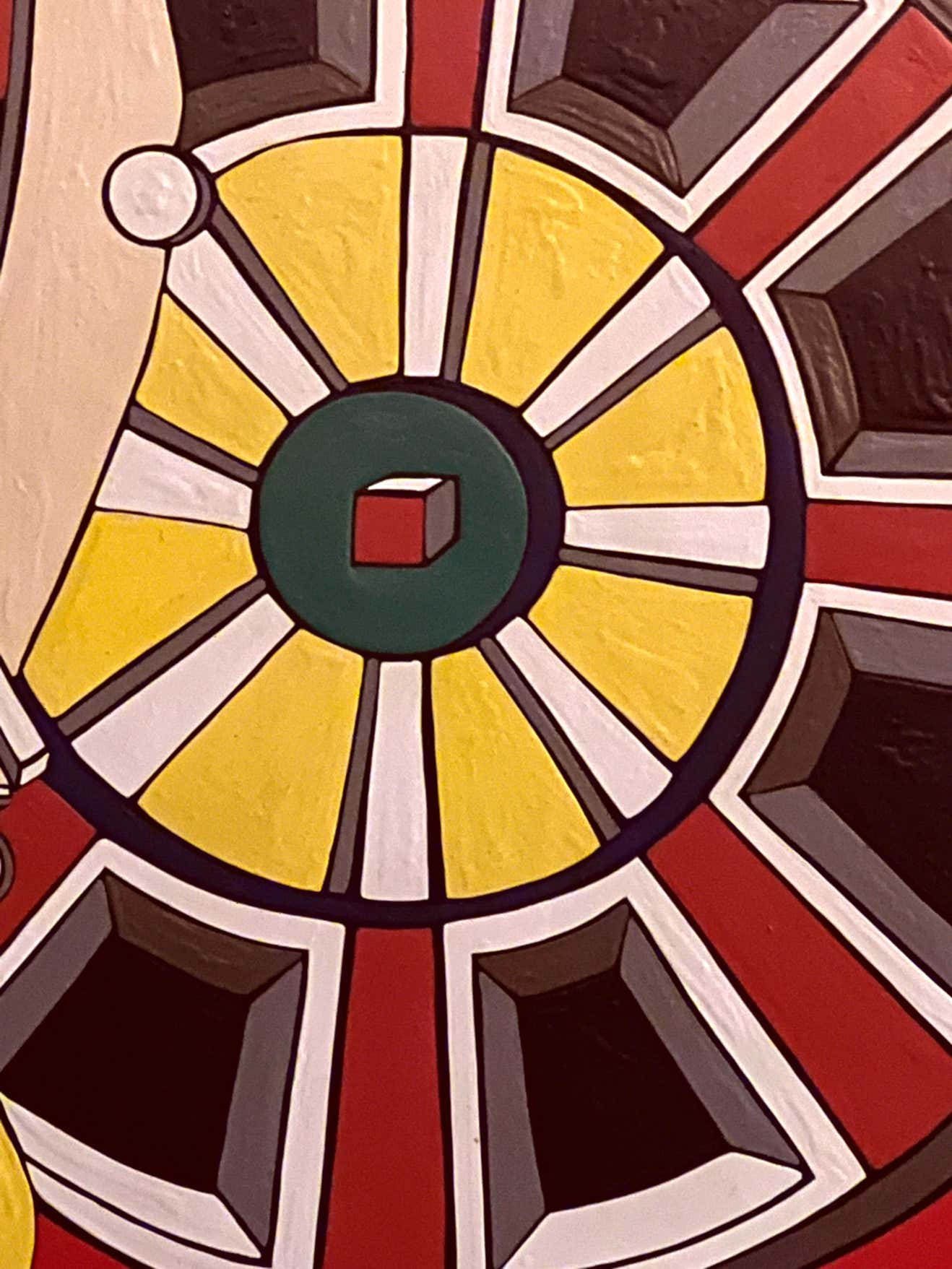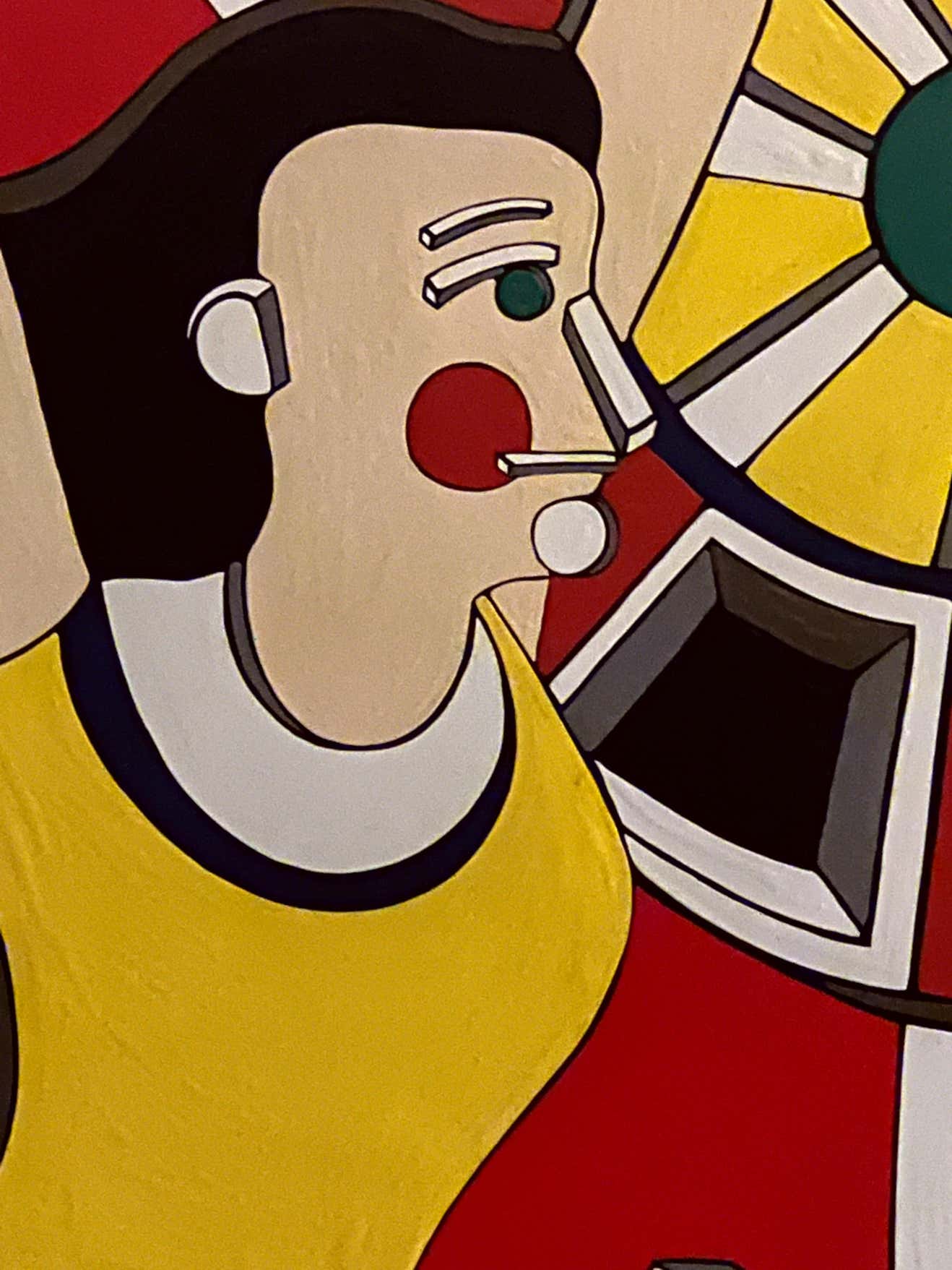As a cultural artefact, the circus holds various symbolic meanings over time, challenging our beliefs while inspiring wonder. In this tribute to Fernand Leger and his 50s Circus series, Lrisé has created a colourful acrylic painting on canvas resembling a collage but without using cut-out pieces. Instead, it presents simple geometric shapes such as squares, triangles, circles, trapezoids, ovals, and ellipses painted in bold contrasts of curves and straight lines - with dark and thick outlines - giving this aerial circus woman the appearance of a Pinocchio or a wooden dummy used for figure drawing.