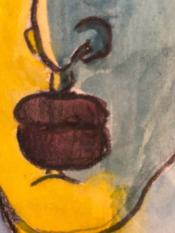 This small-scale painting, more than a decorative work, depicts a face divided vertically into two halves: yellow and soft green. The figure, wearing a beanie and a blue sweater adorned with large red dots, raises questions about duality and the interplay between simplicity and complexity in visual art. Through an economy of line, minimalist forms, and the judicious use of color, the piece invites contemplation of the human psyche. Is this work a self-portrait of the artist? Does it explore the multifaceted nature of human identity or suggest deeper themes related to mental health?
