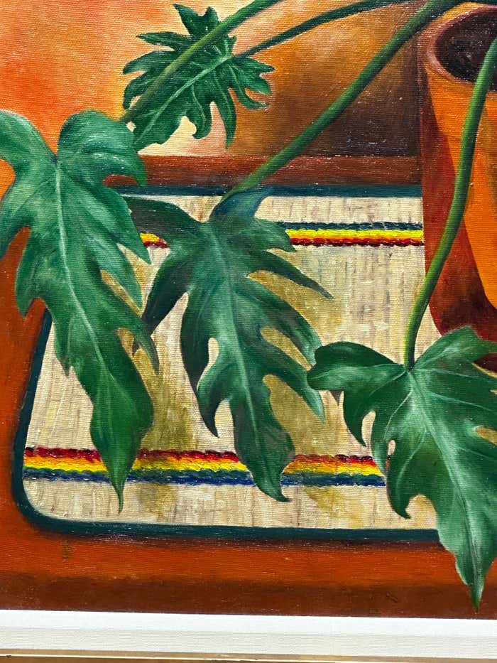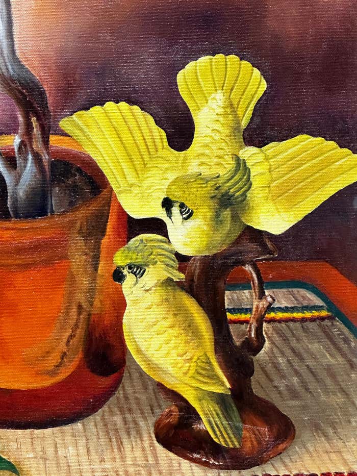 "Two Yellow Parakeets and the Surviving Plant" Oil Painting by Pat Berger