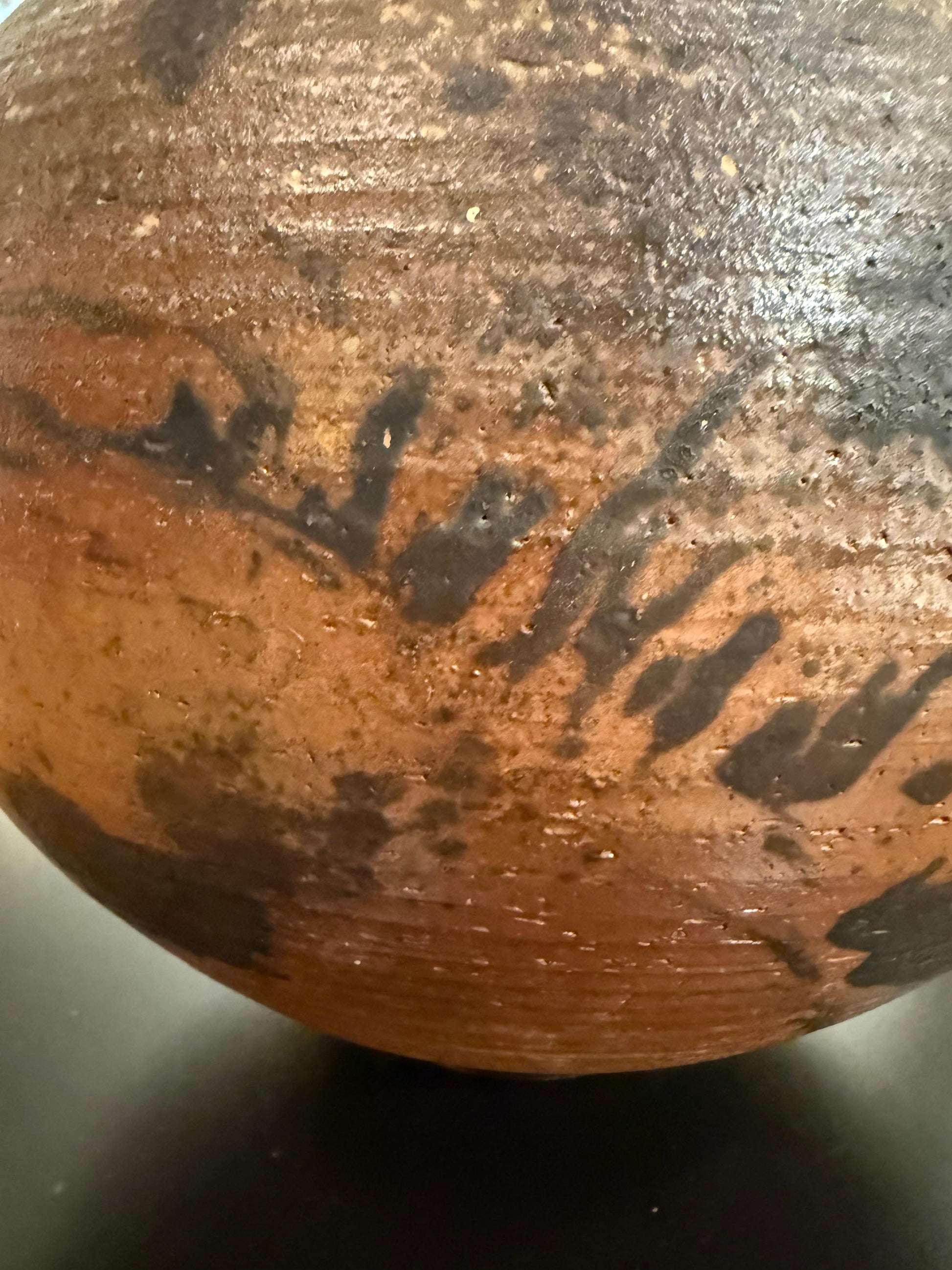 The surface, rich with atmospheric flashes of ochre, charcoal, and umber, bears the preserved evidence of the firing process: subtle speckling, ash deposits, and variegated shifts in tone that create a living landscape across the clay. The fine horizontal throwing lines encircling the vessel add rhythmic texture, emphasizing both the meditative act of creation and the natural beauty of reduction-fired stoneware.